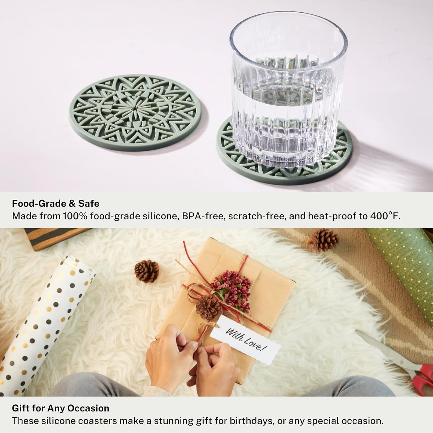 Set of 6 Olive Green Silicone Coasters with Holder, Drink Coasters with Tribal Pattern Shape- for Table Protection, Anti Slip, Nonstick, Heat Resistant, Deep Tray