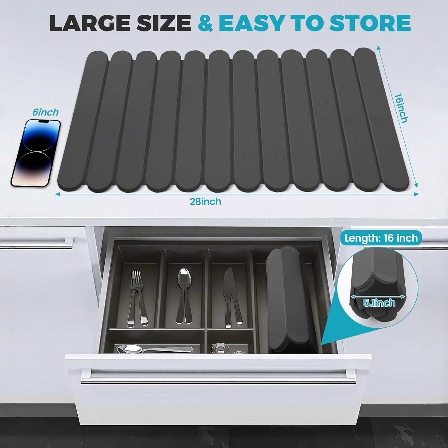 - Collapsible and Space-Saving: Measuring 28"(L)x16"(W) when unfolded, this collapsible stone drying mat offers ample space for your dishes. When not in use, easily store it in drawers or kitchen cabinets, maximizing your kitchen's organization