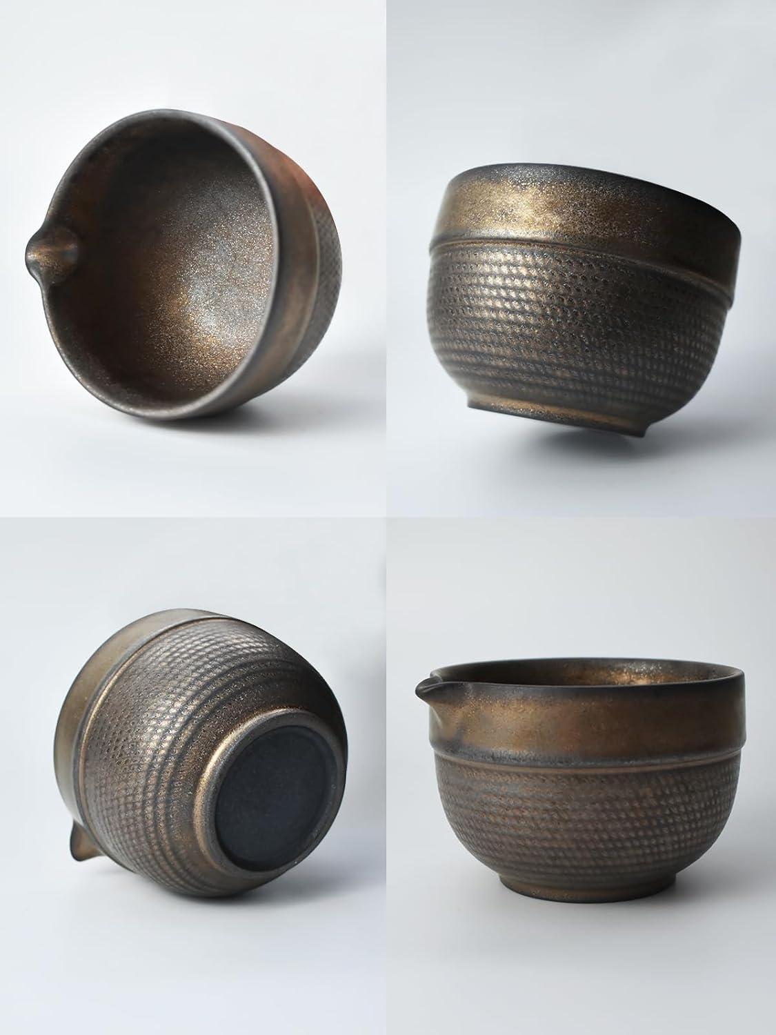 - Artisan Black Glazed Bowl with Pour Spout: The matcha bowl features a handcrafted black glaze with bronze undertones, creating a rich, textured finish that mimics aged metal. The spout design allows for smooth pouring without spills—functional beauty at its finest.