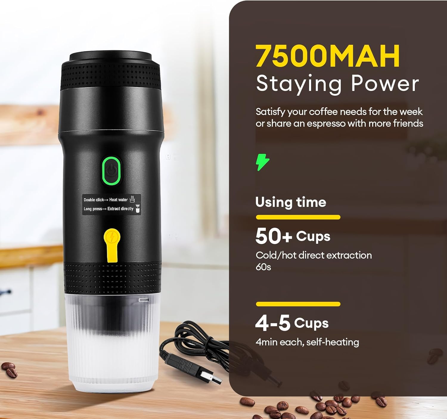 - 【7500MAH Rechargeable Battery】 The travel Espresso Maker is equipped with a 7500mAh rechargeable battery, which is compatible with car and USB charging. (red LED light=charging, green LED light=fully charged). After fully charged, the number of extractions is 50 with cold water directly, 25 with hot water directly and 5 with cold water heated