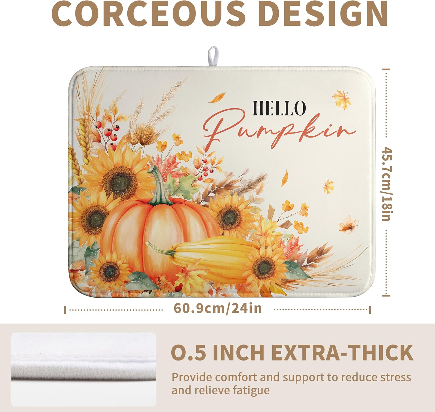 - [Space Saving]: This Thanksgiving Large lightweight absorbent dish drying mat has a webbing lanyard in the middle of the horizontal side for hanging, and floral large drying mat for kitchen counter Autumn dish drying matt kitchen counter can also be folded and thrown into a drawer or stuffed elsewhere.