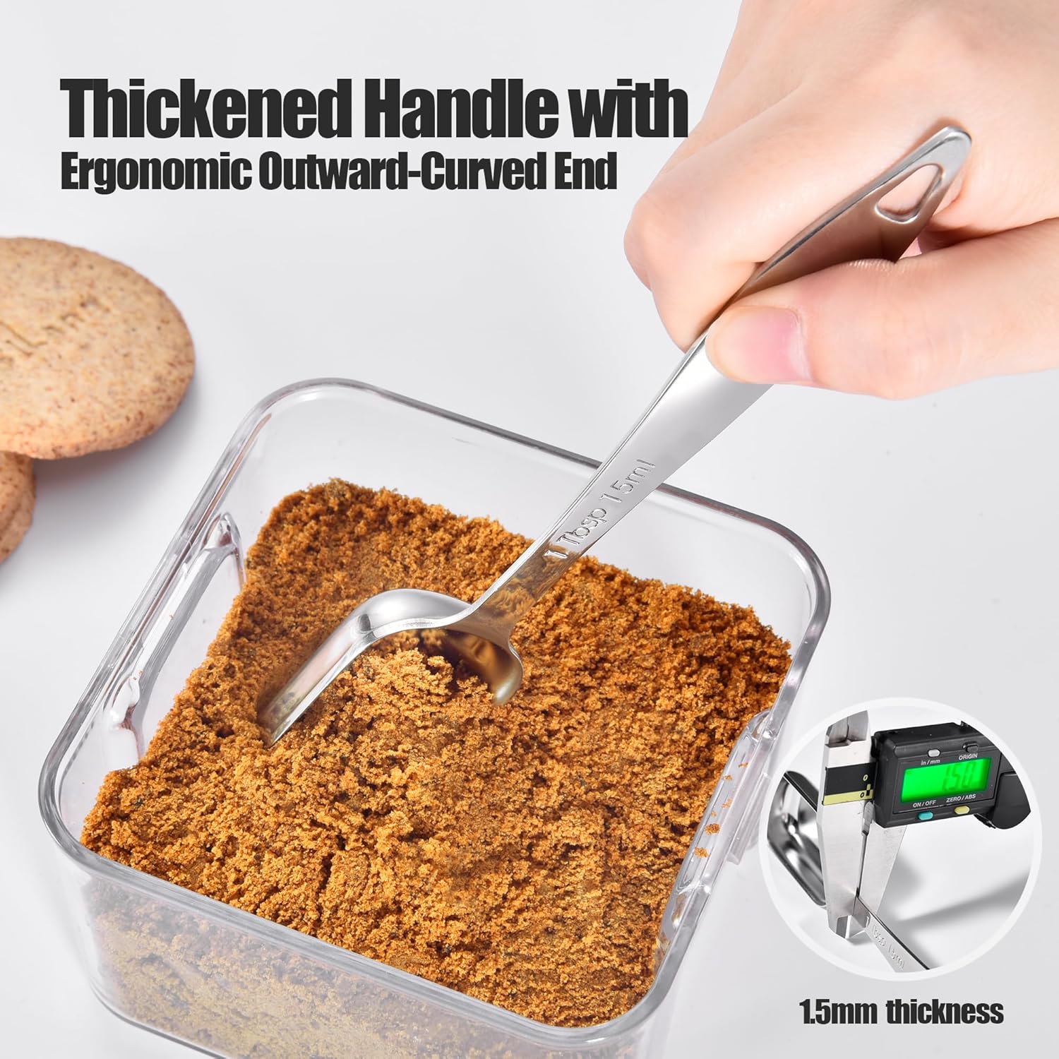 - Does Doosu tablespoon set include a leveler for precise measuring? This stainless steel measure spoon set consists of 1/8tsp, 1/4tsp, 1/2tsp, 3/4tsp, 1tsp, 1tbsp and 1 leveler. By sliding off excess ingredients from the top of each spoon, the handy leveler helps you avoid common mistakes like over-packing flour or spices, improving consistency in your cooking and baking. For beginners, this means fewer recipe mistakes, better texture in baked goods, and more balanced flavors in your dishes.