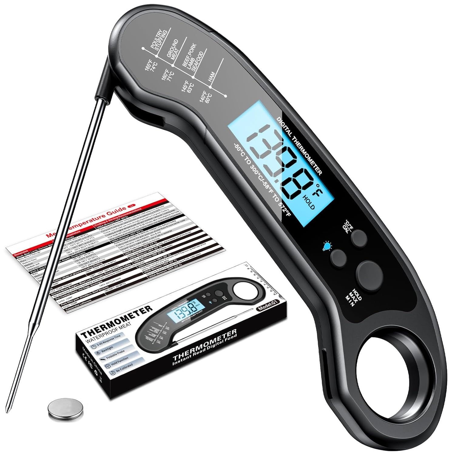 - Included Components : 1 X Meat Thermometer, 1 X CR2032 Battery, 1 X User Manual