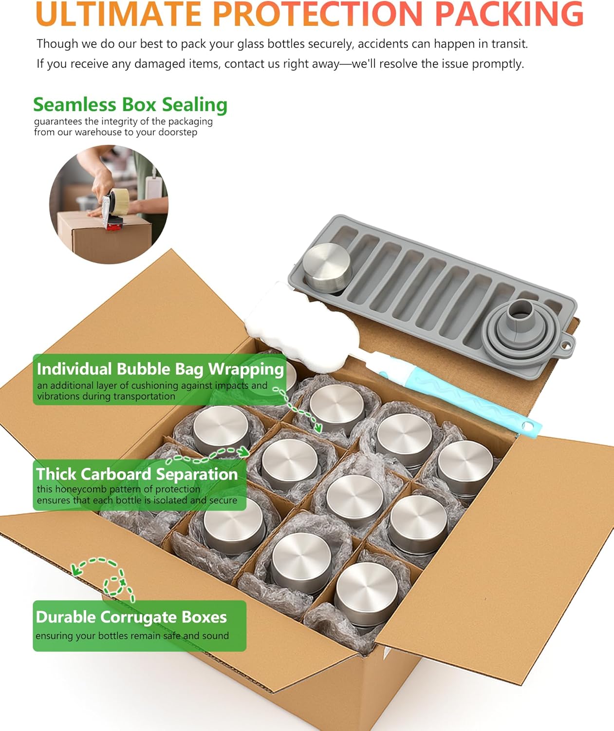 - SAVE MONEY WITH THIS VALUE PACK: Juicing Kit Bundle includes : 16 pack clear 10.5 oz glass milk bottles with airtight lids, a bottle cleaning brush for easy hand washing, a funnel helps you pour liquids inside the glass juice containers, an ice tray makes narrow ice cubes for adding ice easily, extra 1pc stainless steel airtight lids to ensure that the glass smoothie bottles always remain sealed. Get our juicing jars in bulk packs as gift for your whole family and friends.