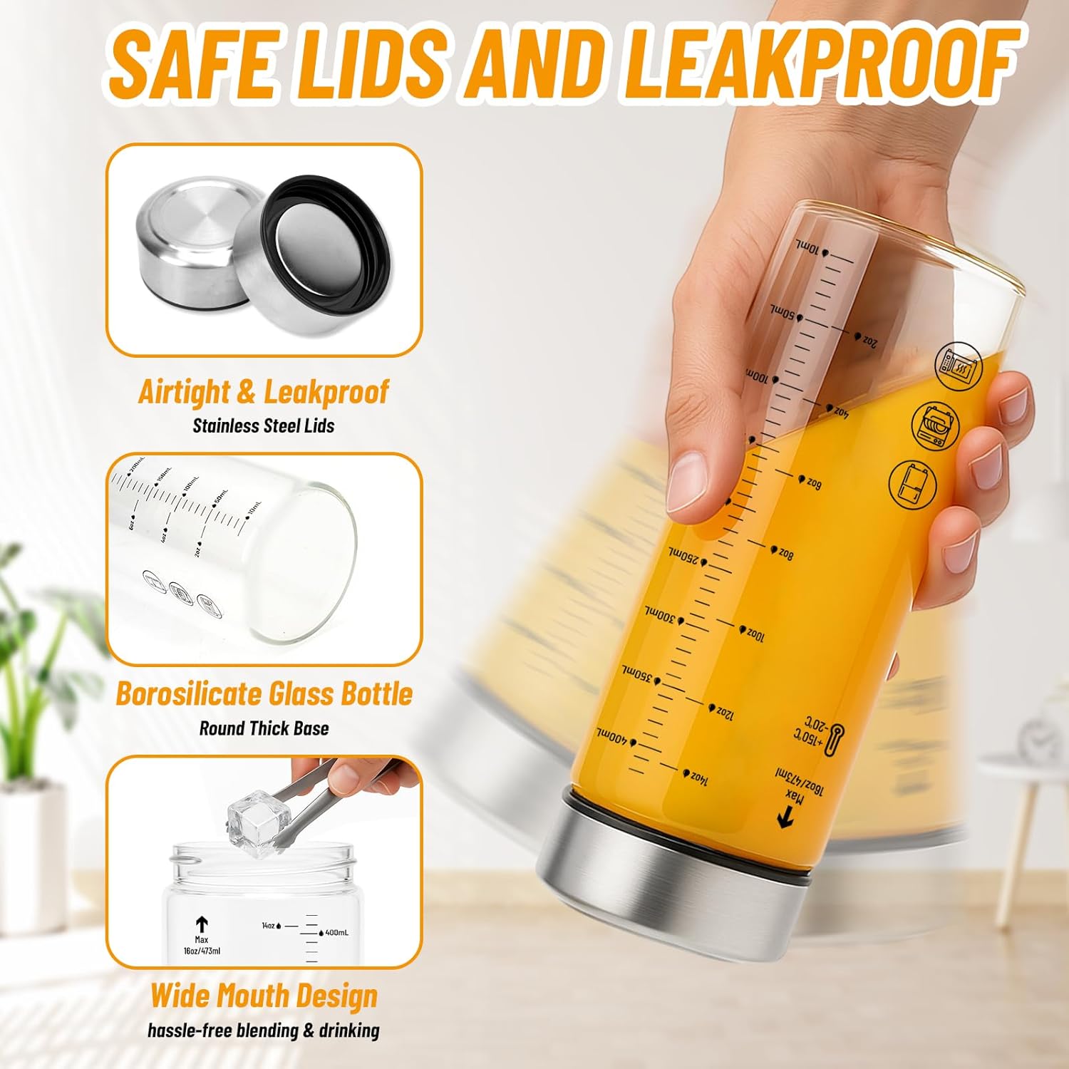 - Premium Borosilicate Glass & Durable:Crafted from high-quality borosilicate glass, our 16oz juice bottles resist thermal shock and cracking. Crystal clear and odor-free, they keep your beverages fresh and pure—perfect for juicing, smoothies, or cold brew coffee