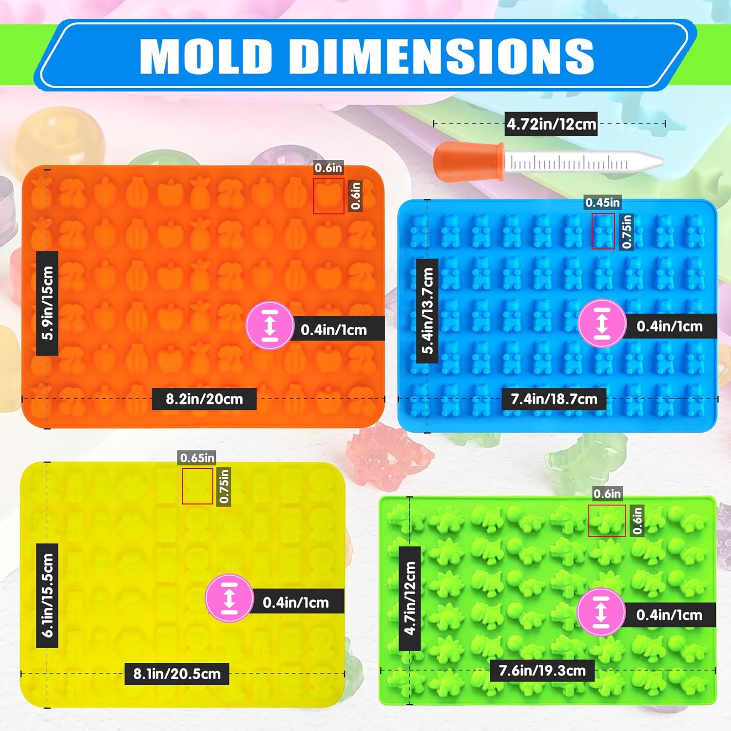Silicone Gummy Molds Set of 4, Non-stick Candy Chocolate Molds with 2 Droppers 2 Clean Brush, Includes Dinosaur Bear Fruit Animal Shape