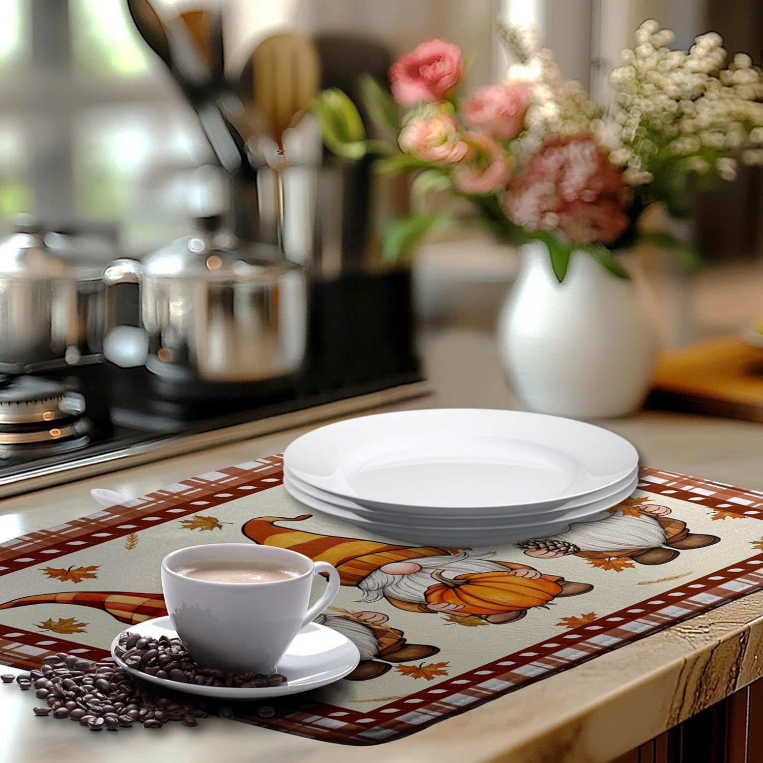 - [Multi-functional]: This Fall Gnomes dish drying mat can be placed under the dish rack to collect dripping water to keep the counter dry and clean, or you can place bottles, pots, plates, bowls, cups and other utensils directly on the mat. Fall Pumpkin Rustic Large dish drying mat can also be placed under the coffee machine to absorb spilled coffee.