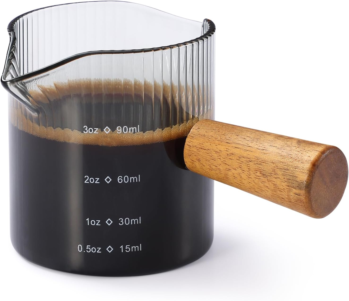 Espresso Cups 3 OZ, Double V-Shaped Spouts Cups, Espresso Shot Glasses with Wood Handle, Ribbed Milk Measuring Cup
