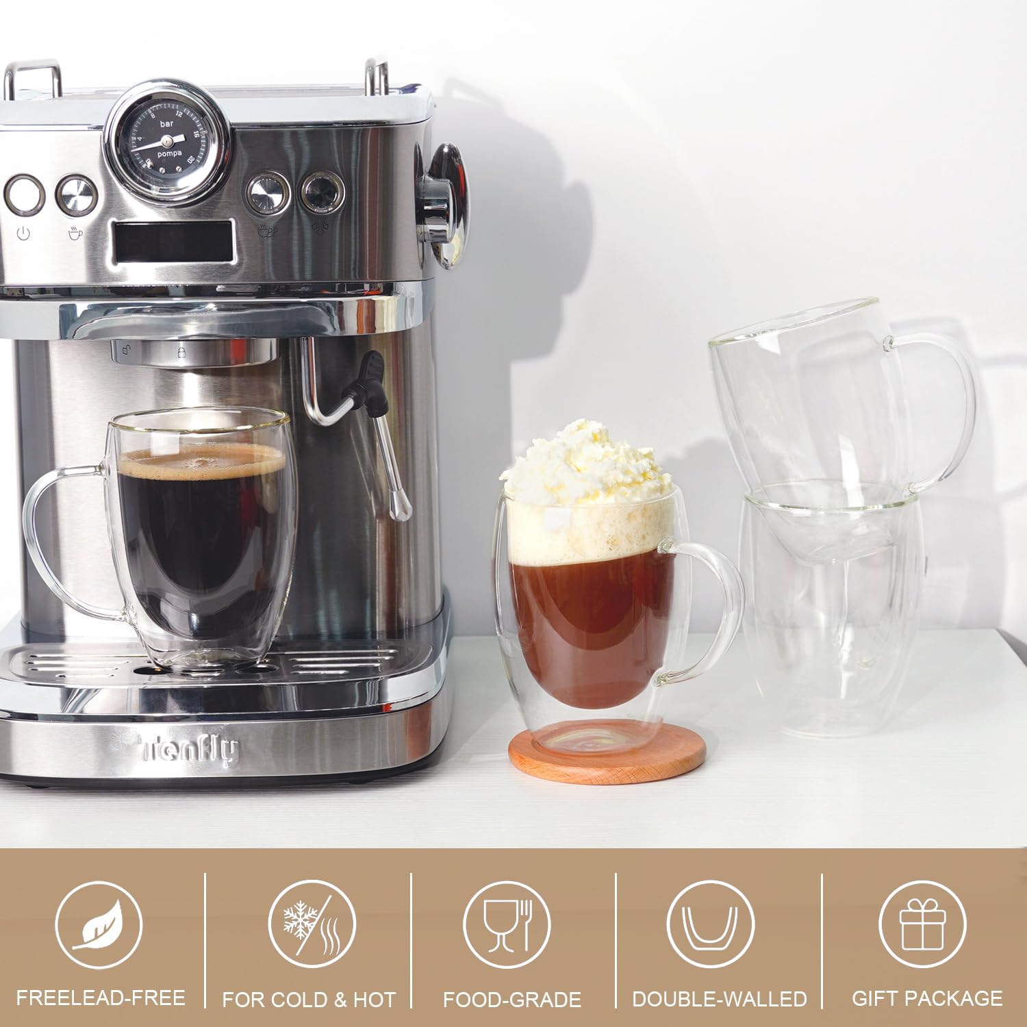 - DOUBLE WALLED INSULATED DESIGN: The glass mug is double-walled, so even if you put something cold or warm in it, the temperature won't be transmitted, and it won't condense. Espresso cup with handle design, comfortable to hold in your hand, enjoy hot and iced drinks, with innovative insulated double-wall design and modern appearance.
