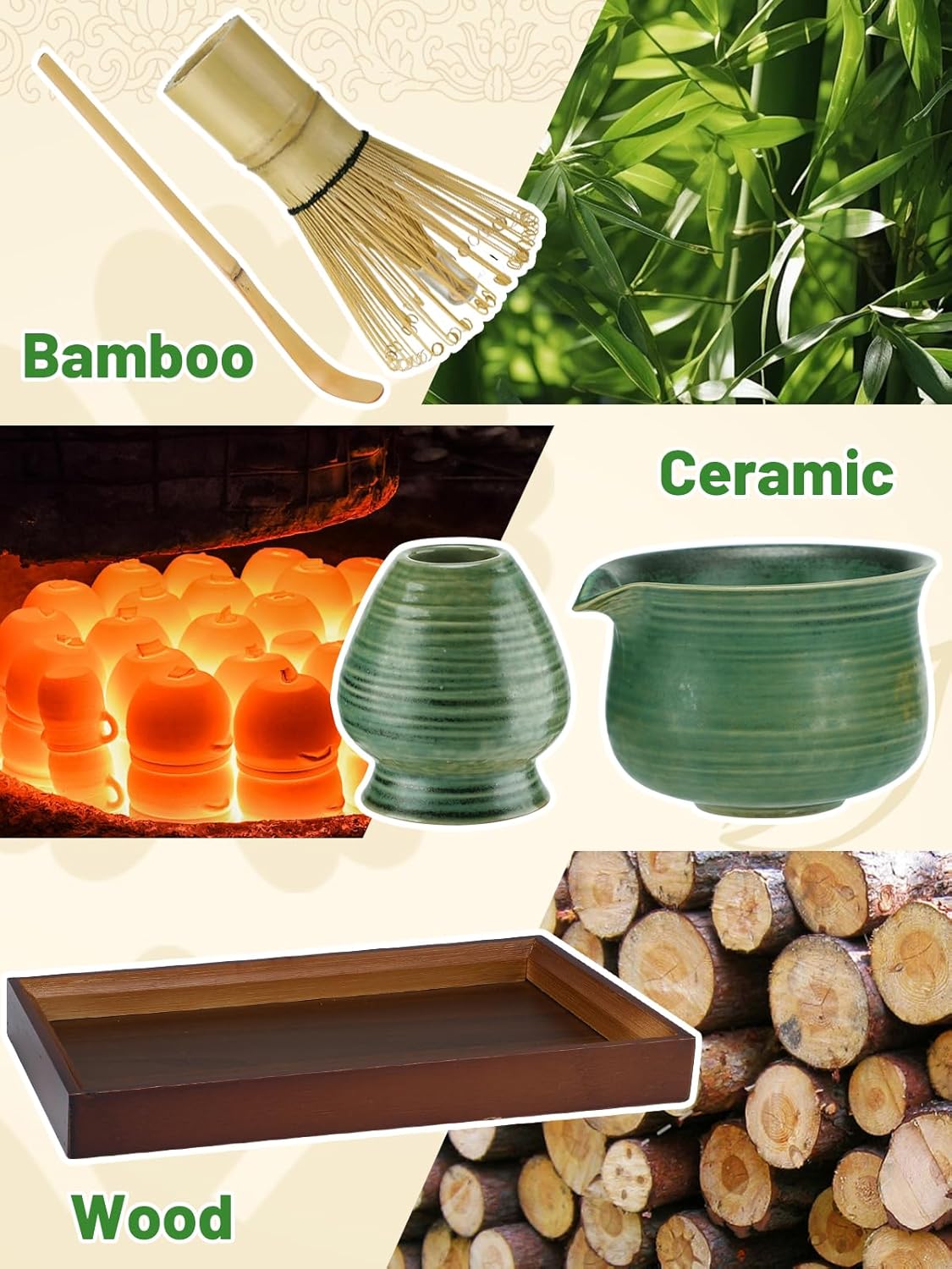 - Matcha Set for Authentic Preparation: Includes a wooden tray, a ceramic matcha bowl (chawan), bamboo whisk (chasen), whisk holder, and bamboo scoop (chashaku) —everything you need to whisk, serve, and enjoy matcha at home or in a tea ceremony.