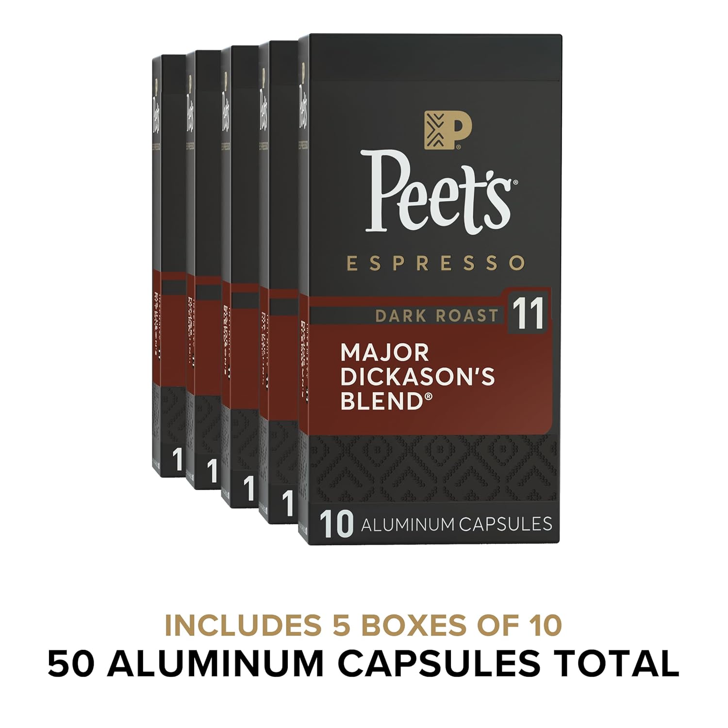 - Contains five (5) Boxes of 10 Peet's Major Dickason's - Intensity 11 Dark Roast Coffee Single Cup Espresso Capsules (50 Espresso Capsules Total)