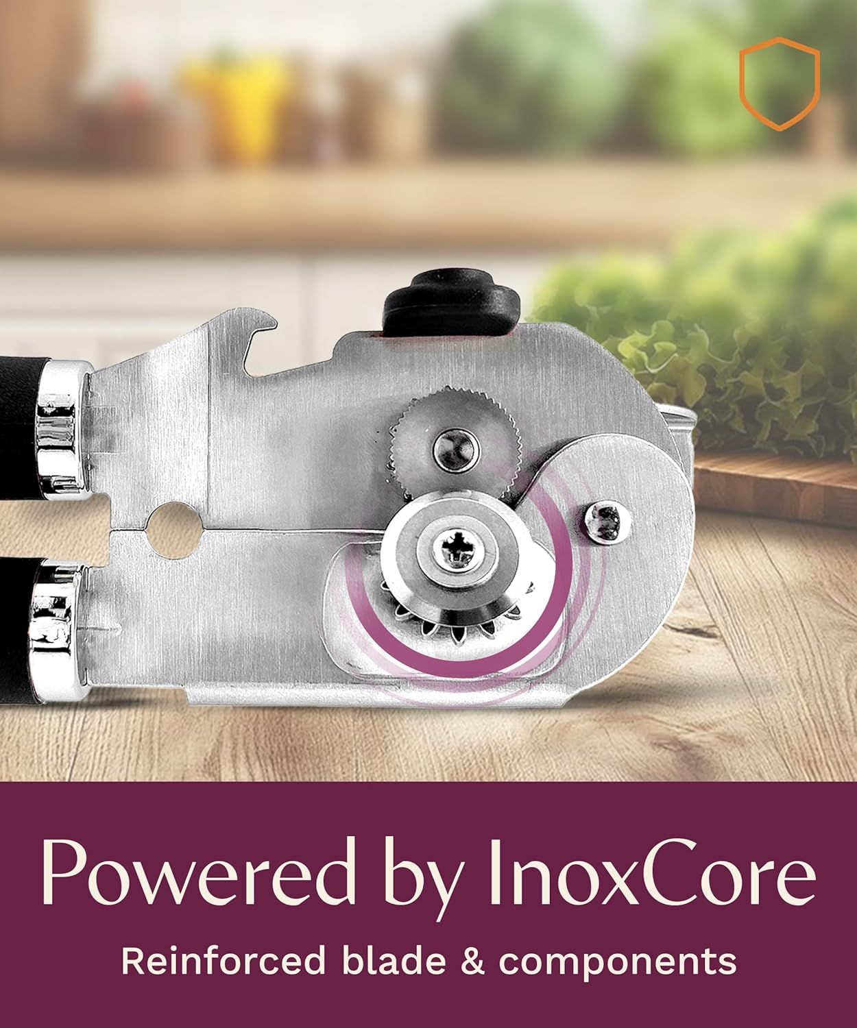 - 【INOXCORE Rust-Proof Stainless Steel Can Opener & Precision Gears with Ultra-Sharp Blade for Smooth-Edge Cuts】 Constructed with reinforced INOXCORE stainless steel components, rust-proof finish, and precision-aligned gears, this premium kitchen tool houses a razor-sharp, high-carbon blade for smooth-edge, jag-free cuts every time. Its solid weight and brushed exterior delivers lasting sharpness and a premium feel.