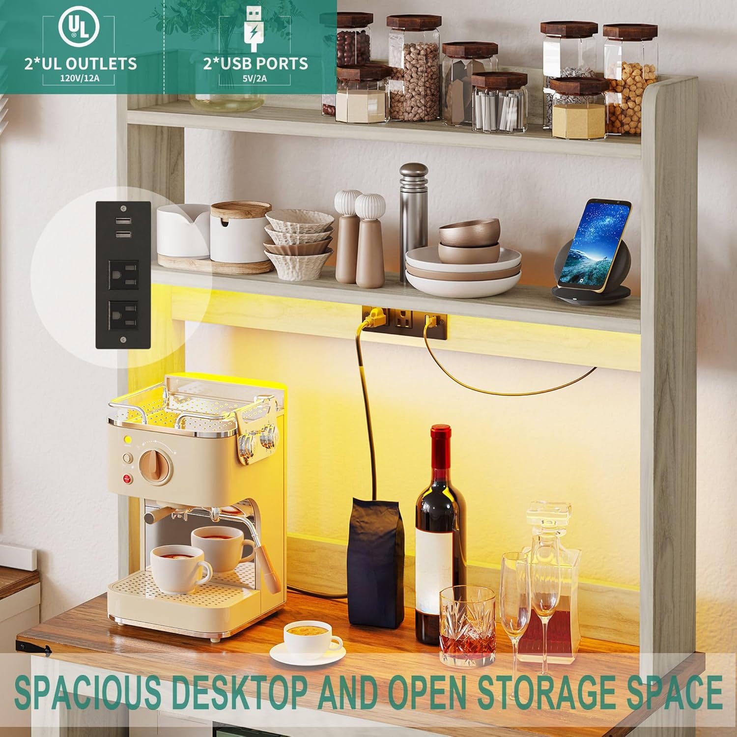 - Bakers Rack with Power Outlets: Our coffee bar cabinet has 2 AC outlets and 2 USB ports to power your devices.If you are a coffee lover, you can plug in your coffee maker and learn and make your own coffee drinks