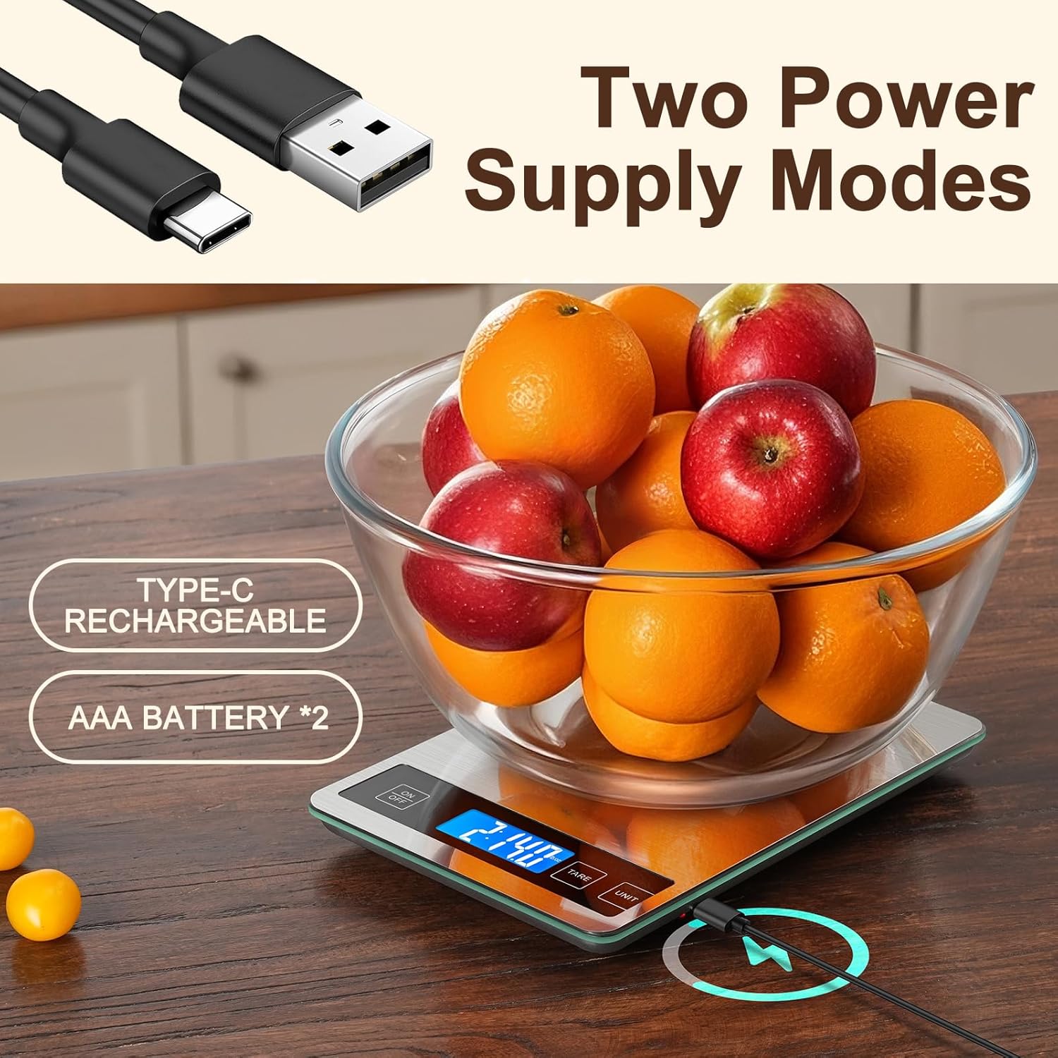 Food Scale, 33lb Digital Kitchen Scale with Stainless Steel & Tempered Glass, USB Rechargeable, 1g / 0.05oz Precise Graduation, Waterproof and Sturdy Surface, for Cooking, Baking, Weight Loss