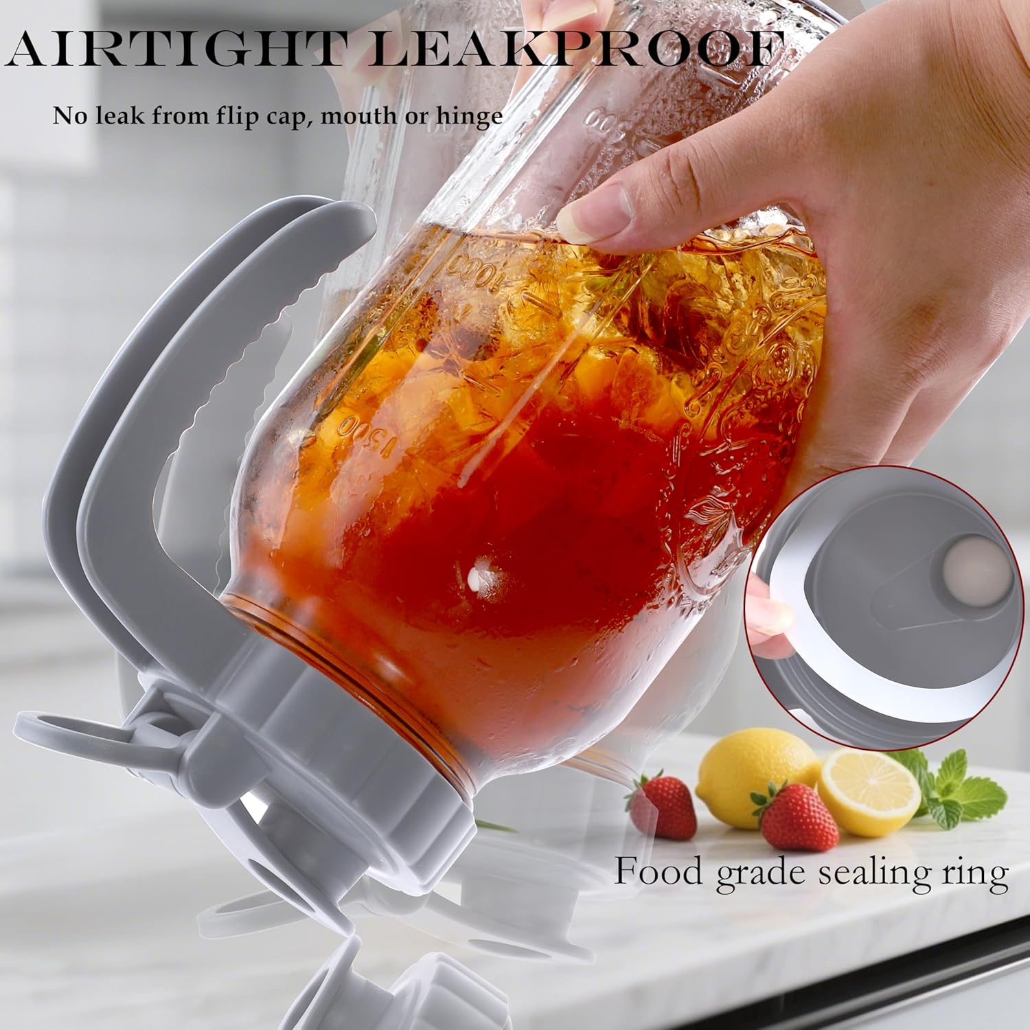 - Sealing Capabilities - Without worrying about spills or contamination. Glass Mason Jar Pitcher with silicone seal that will ensure not leak what so ever,even while shaking it upside-down. The top flip cap has a secure snap fit closure that will not leak neither. Airtight container to keep your drinks fresh!