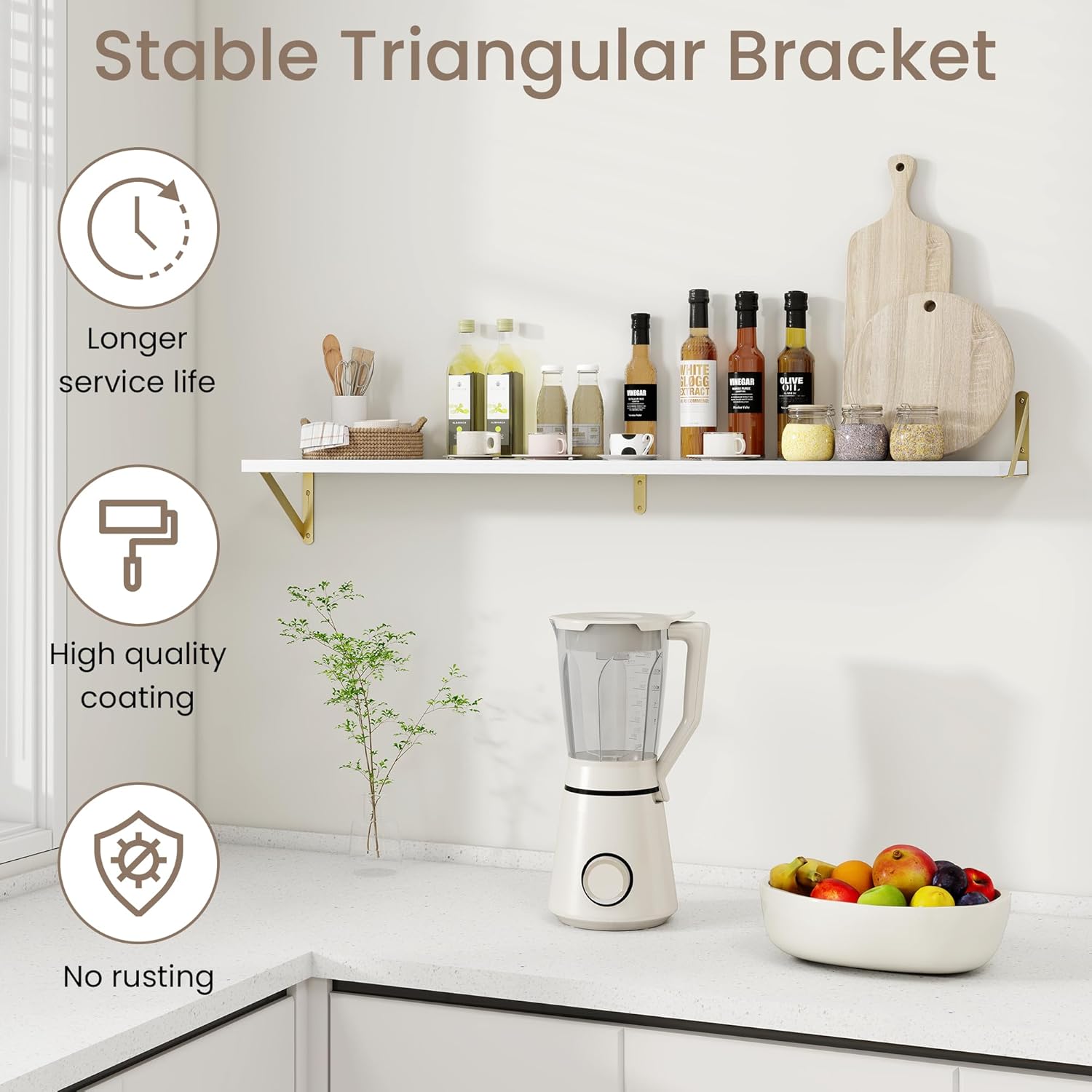 Dreamland White and Gold Shelf, 48W x 8D Wall Mounted Shelves Set of 2, Wide Display Ledge Shelf with Sturdy Metal Brackets for Living Room, Bathroom, Bedroom and Kitchen, White with Gold Brackets