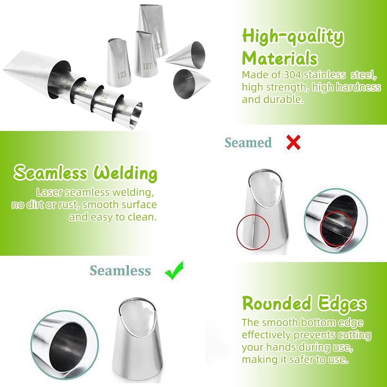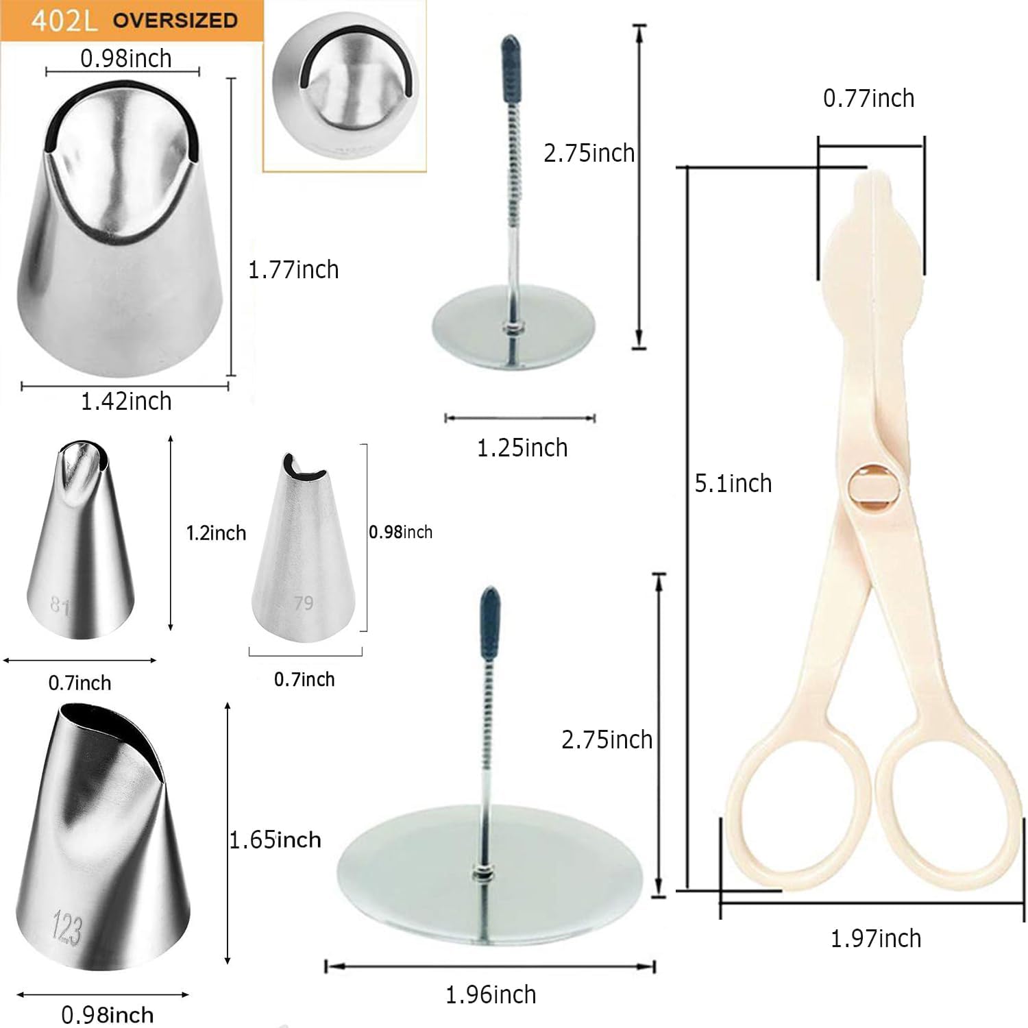 - Essential Cake Decorating Kit: 23-piece rose piping nozzles set (including 2different size of cake flower nail(3.2cm-5.1cm)1cleaning brush, 5disposable piping bags, 6pastry bag ties, 1piping scissors) and 8 flower icing piping nozzles ( 79,81,123,124,125,126,127,402L) Piping nozzle tips and flower nails are made of high quality stainless steel, Washable dishwasher, rust-free, corrosion-resistant, smooth surface, seamless material,providing you with all the essential tools for intricate flower decorations
