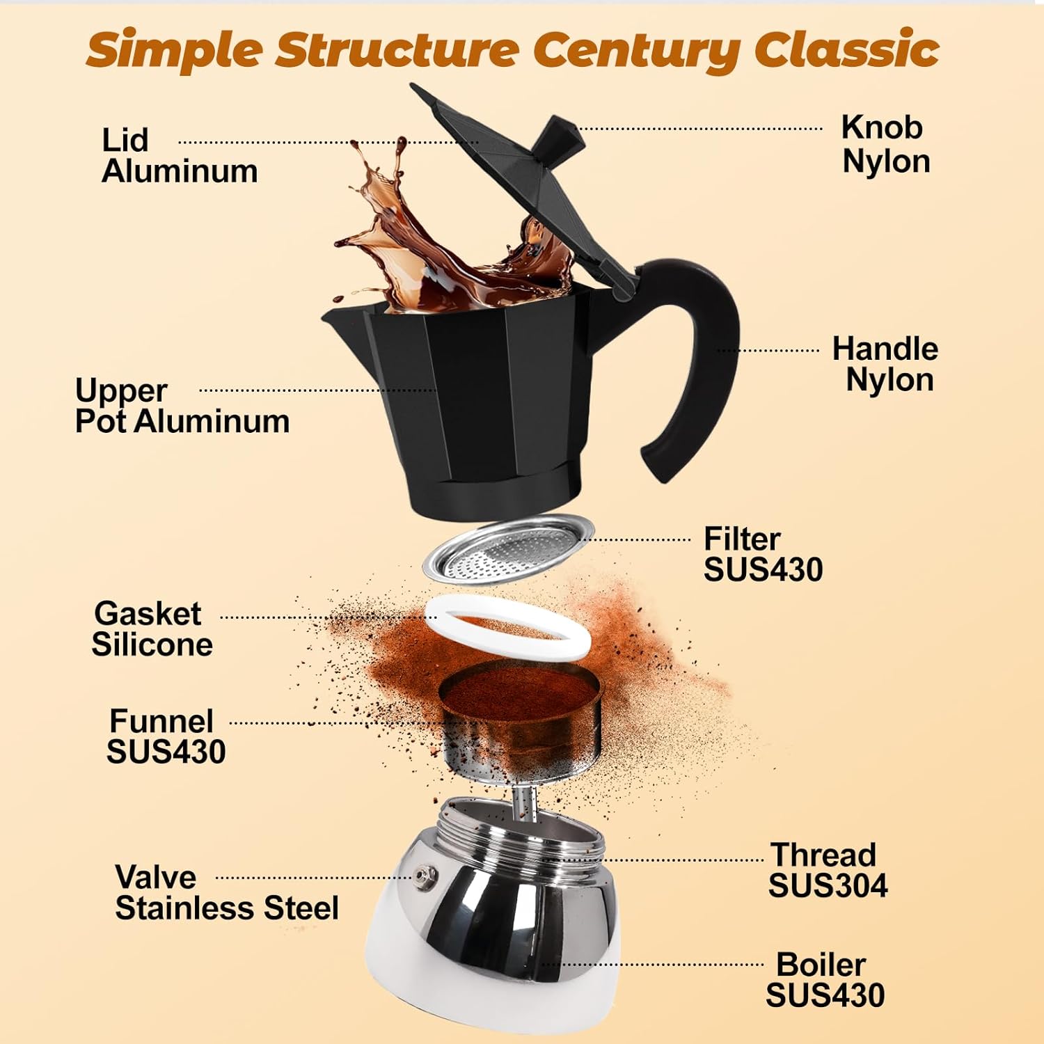 No Coating 4 Cup Aluminum and Stainless Steel Moka Pot Stovetop Espresso Maker Italian Coffee Machine 220ml 7.44oz Suitable for Gas Induction Stovetop Greca Coffee Maker Percolator Black