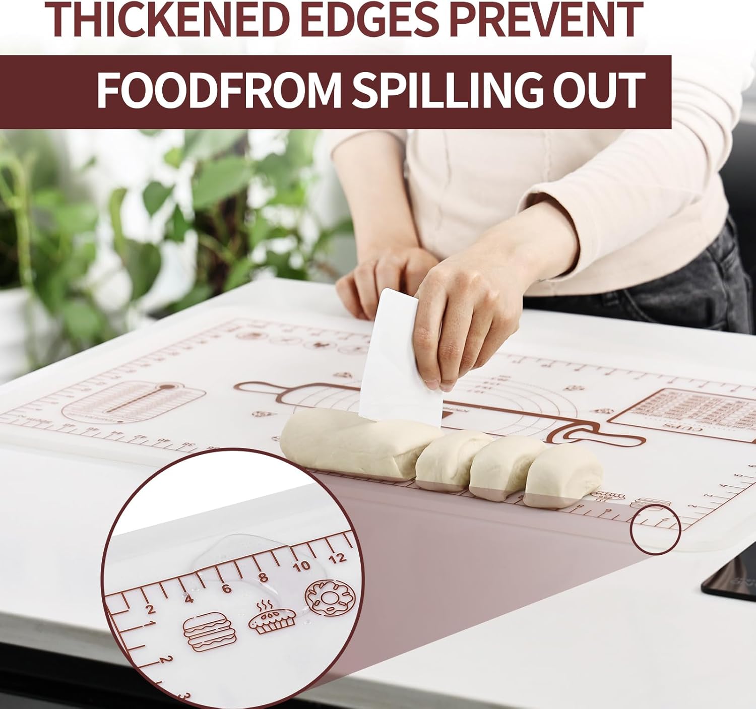 - 【Double thickness】The thickness of silicone rolling mat is 0.8mm and the edge height is 4mm. The unique raised edge design can prevent the water from leaking when you knead the dough, keep your desk clean. Dough mat of is much thicker and more durable, so it is very hard to wrinkle and move when you roll out the dough.