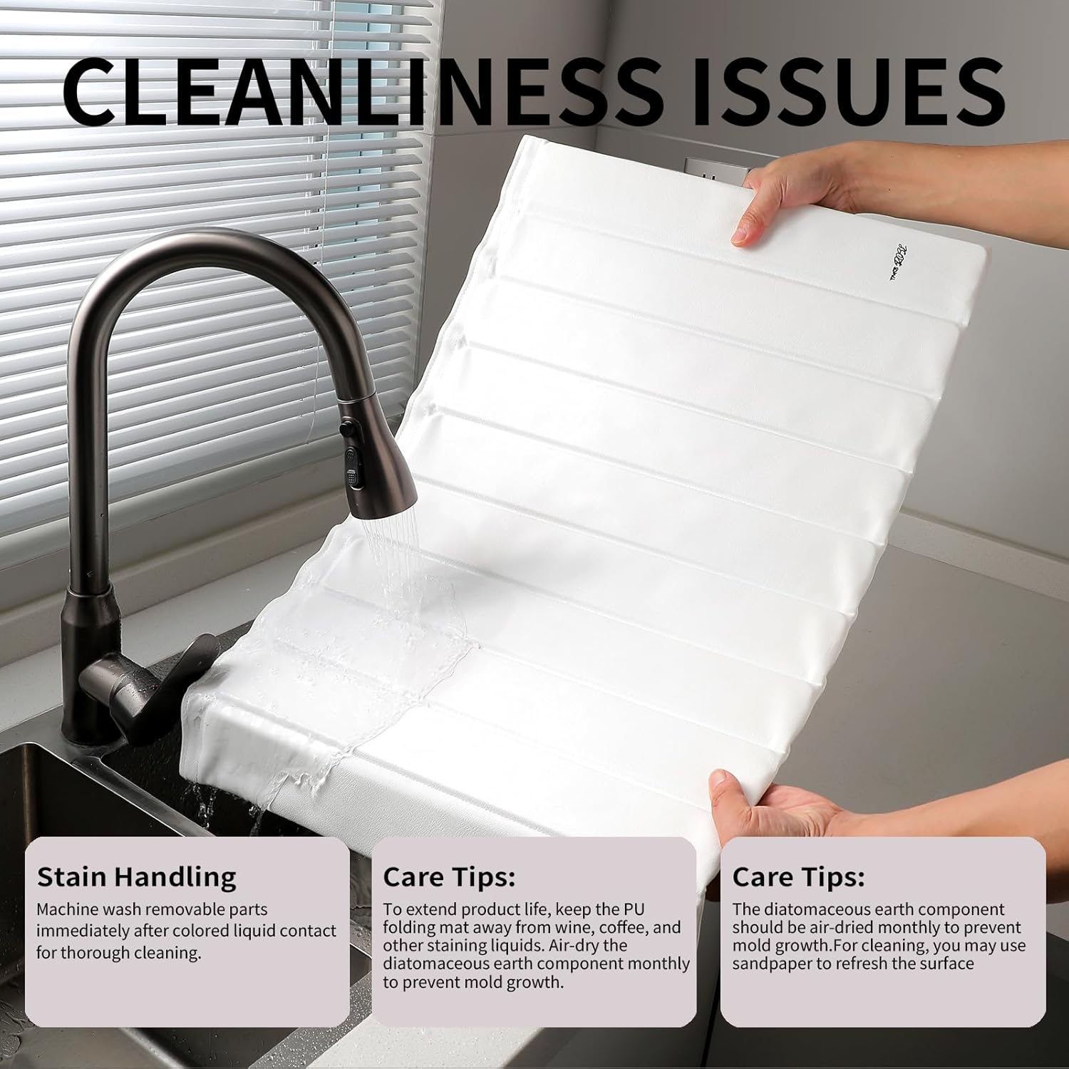 - [EASY TO CLEAN AND MAINTAIN] If our dish drying mat accidentally gets stained, promptly putting it into the washing machine can help remove the stain. Let the diatomaceous earth mat air-dry in a well-ventilated area once a month