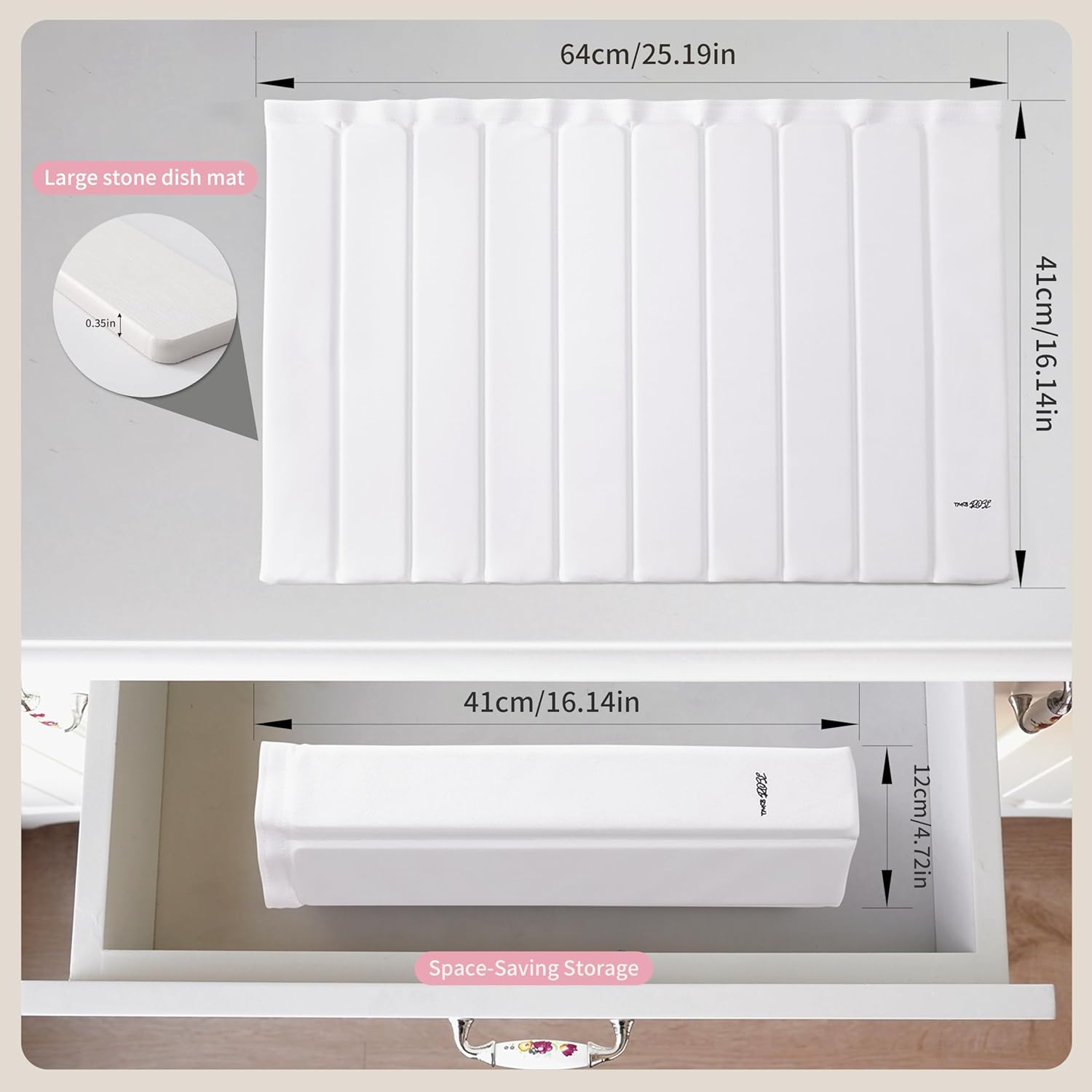 - [FOLDABLE STONE DISH DRYING MAT] This 24"×16" stone drying mat fits dishes, pans, and more. Easily folded or rolled for compact storage. Remove the diatomaceous earth strips or fold to fit any kitchen space.