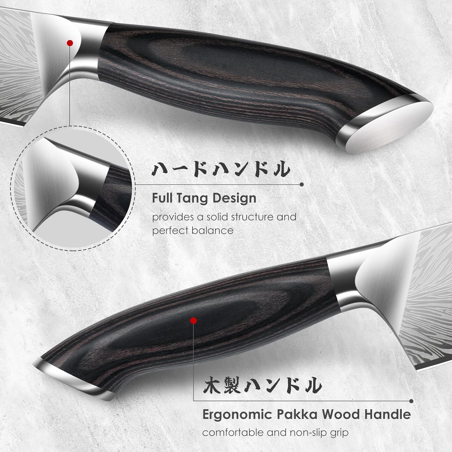 - [Ergonomic & Anti-Fatigue Wood Handle] The kitchen knives blade seamlessly integrates with a comfortable handle, providing you with a perfect grip. The ergonomic shape offers the right balance between handle and blade, ensuring easy maneuverability. Made of durable pakkawood, known for its excellent resistance, the handle is solid and ergonomically balanced