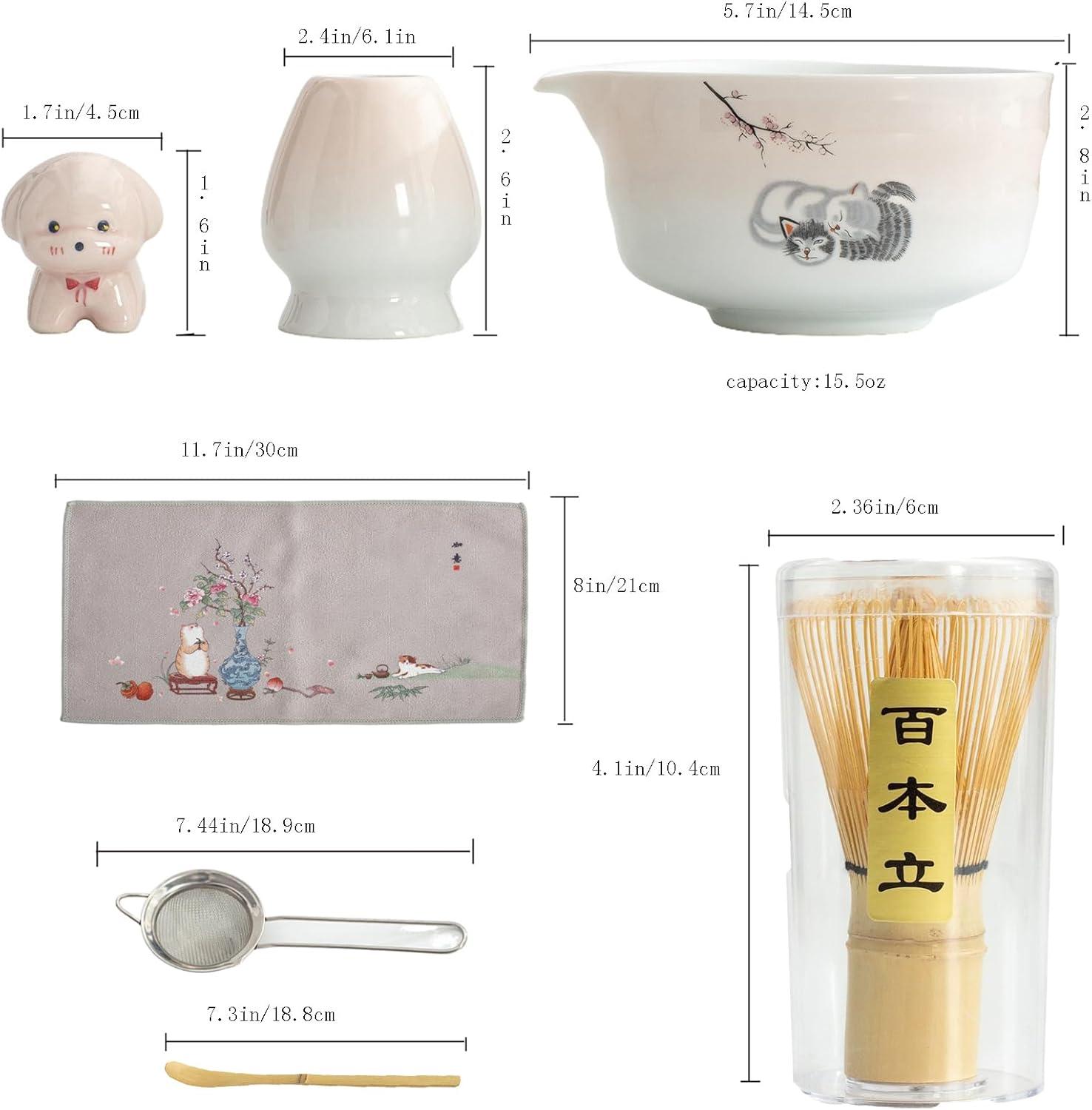 - 1: 7-piece matcha whiskey set: 1 520ml/19oz ceramic bowl, 1 bamboo whiskey, 1 bamboo spoon, 1 Cermaic whiskey holder, 1 ceramic spoon holder, 1 cotton tea cloth, 1 matcha powder sifter. All accessories are included, perfect gift for matcha lovers.