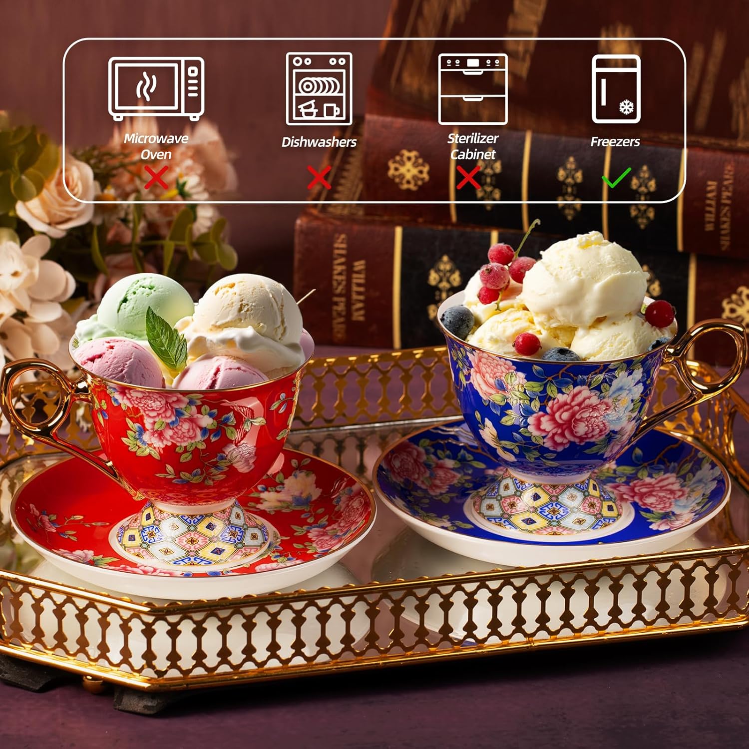 - 【Ideal Capacity】Each vintage cup holds 9.8oz (~280ml), perfect for savoring a full brew without constant refills. Paired with matching saucers for a complete tea experience. Care: Hand wash only—avoid microwaves, ovens, and dishwashers to preserve the gilded finish. Gently wipe dry to maintain brilliance.