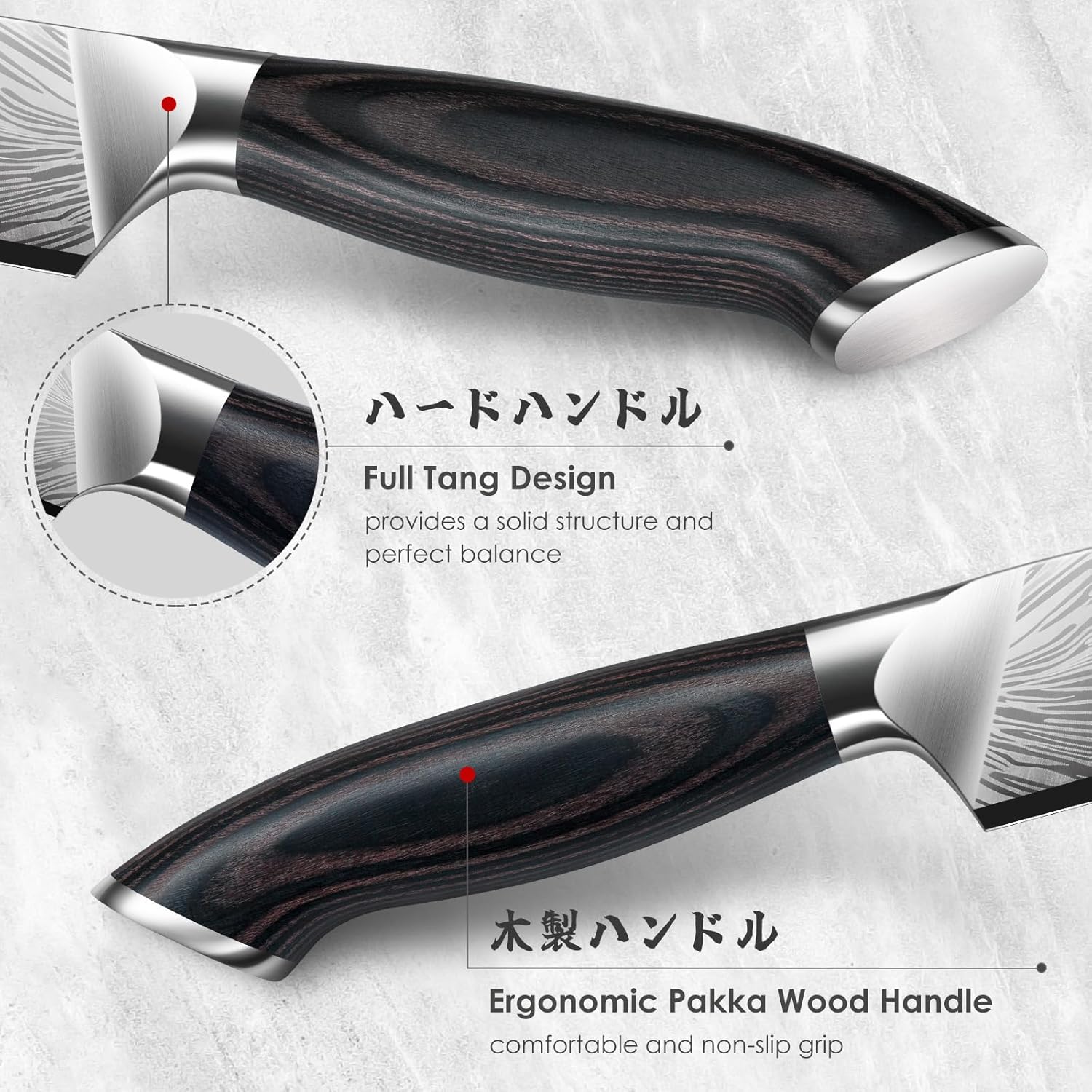 - [Fashion Laser Engraved Pattern] This japanese steak knives features a design that combines traditional aesthetics with modern elements. Engraving a stylish texture pattern on the blade's surface by laser makes the knife look more advanced and fashional. NOTE: THIS IS NOT DAMASCUS KITCHEN KNIFE