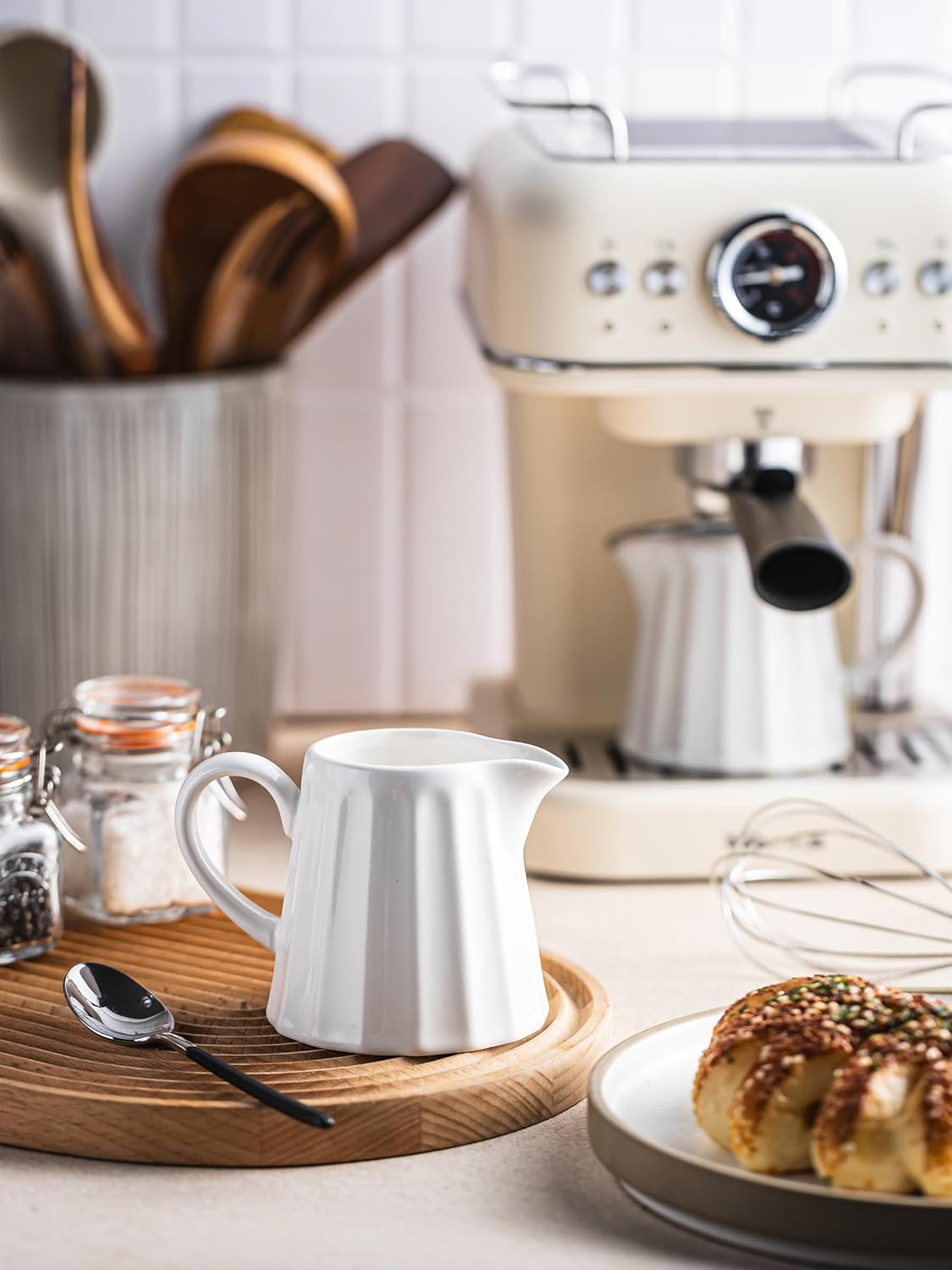 - Charming Striped Design: This ceramic milk pitcher features a vertical striped texture with a soft white glaze and rustic rim, adding a cozy, timeless touch that pairs beautifully with modern, farmhouse, or vintage table settings