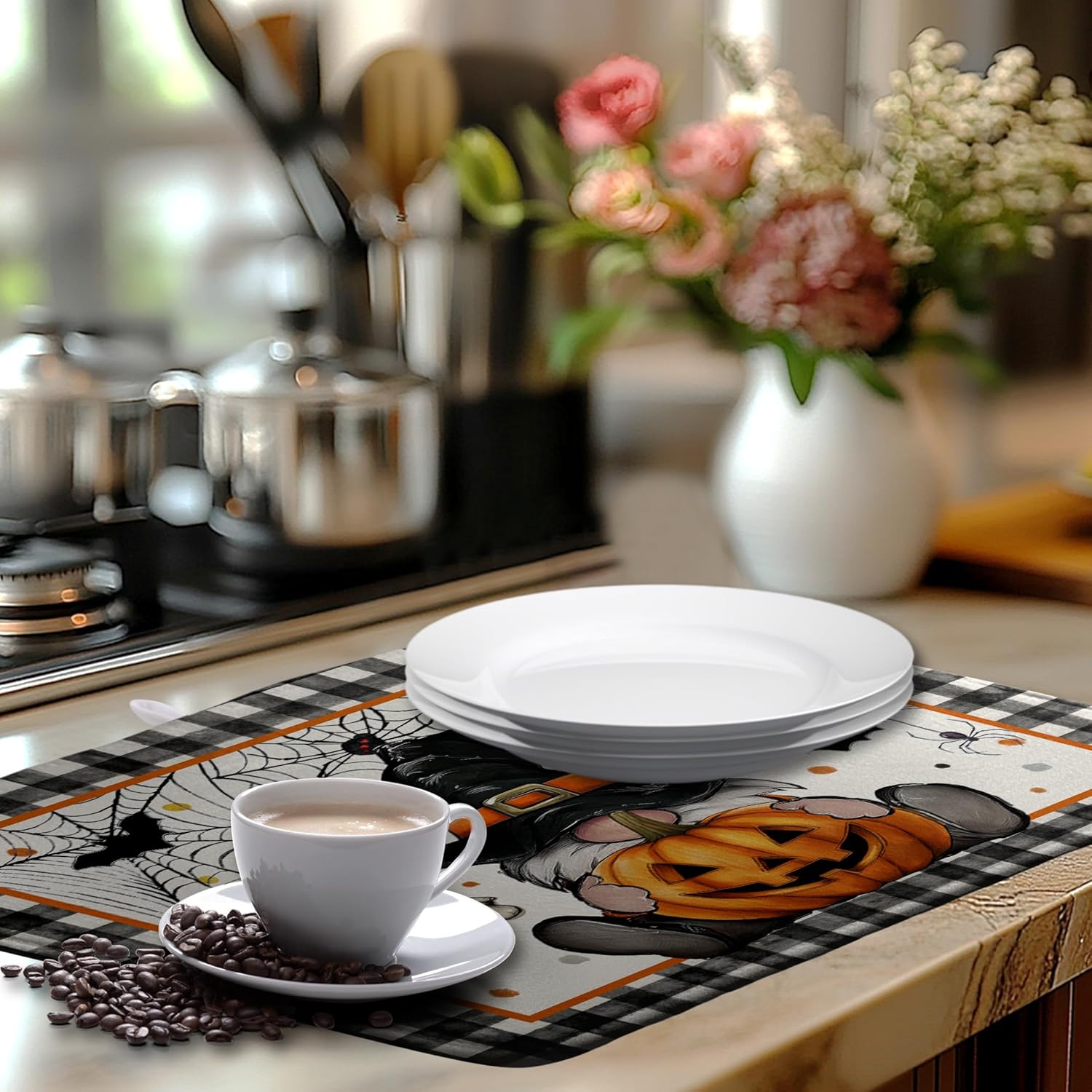 - [Quick Absorption]: Made of absorbent material, our Halloween Gnomes dish drying mat Halloween Large kitchen mat Buffalo Plaid dish dryer mat for kitchen absorbs water stains quickly, keeping your table top dry and clean, avoiding water stains and leaks, providing you with a pleasant and dry dining or working experience.