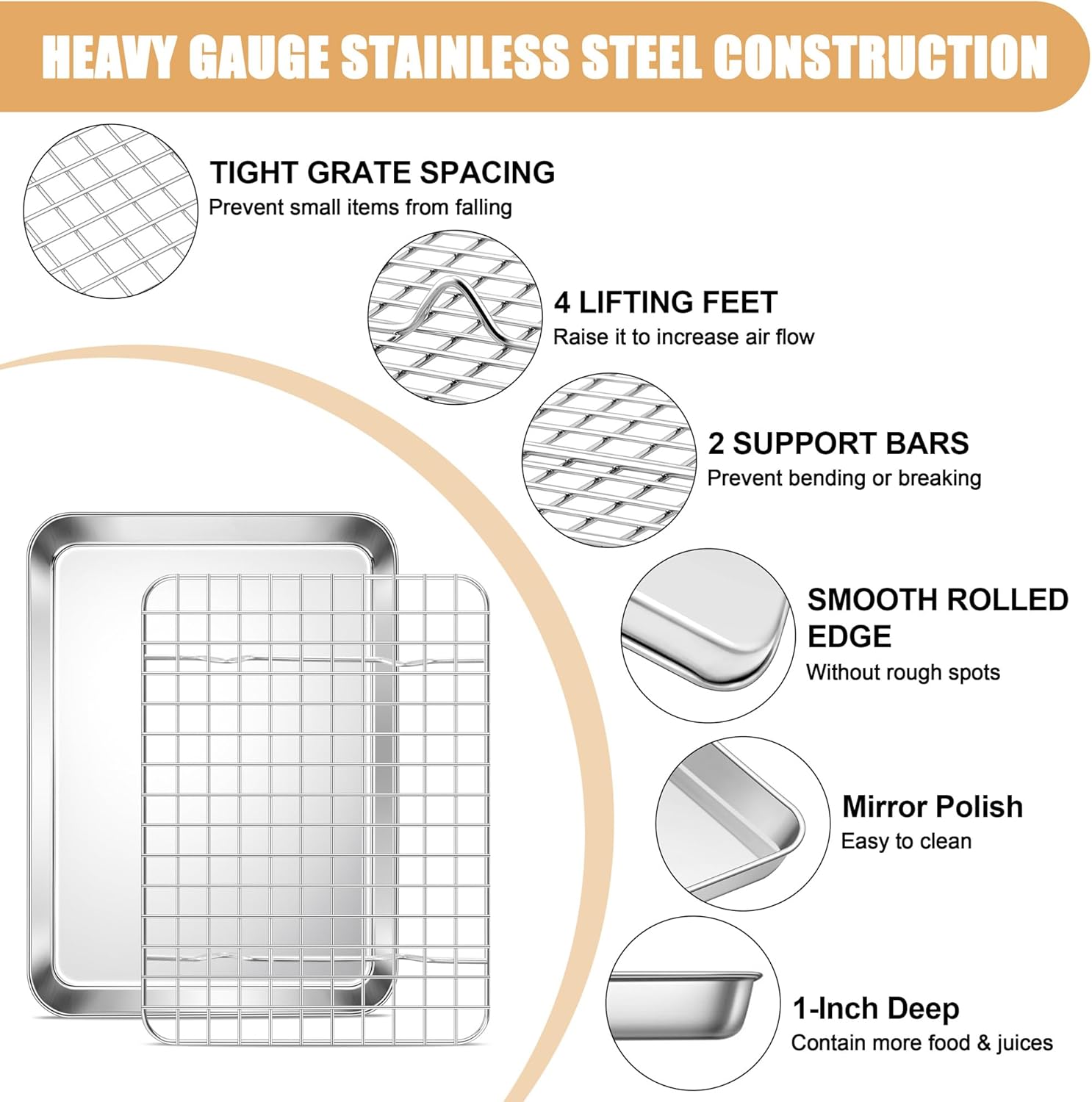 - BAKING PAN WITH RACK SET: Including 1 cookie sheet 9.4 x 7.3 x 1 inch and 1 cooling rack 8.6 x 6.2 x 0.6 inch, Suitable for most regular ovens and small toaster ovens, can be used together or alone, Ideal for everything from baking and cooling cookies, pastries, and breads to roasting cuts of meats and vegetables, Meet your daily baking or baking needs