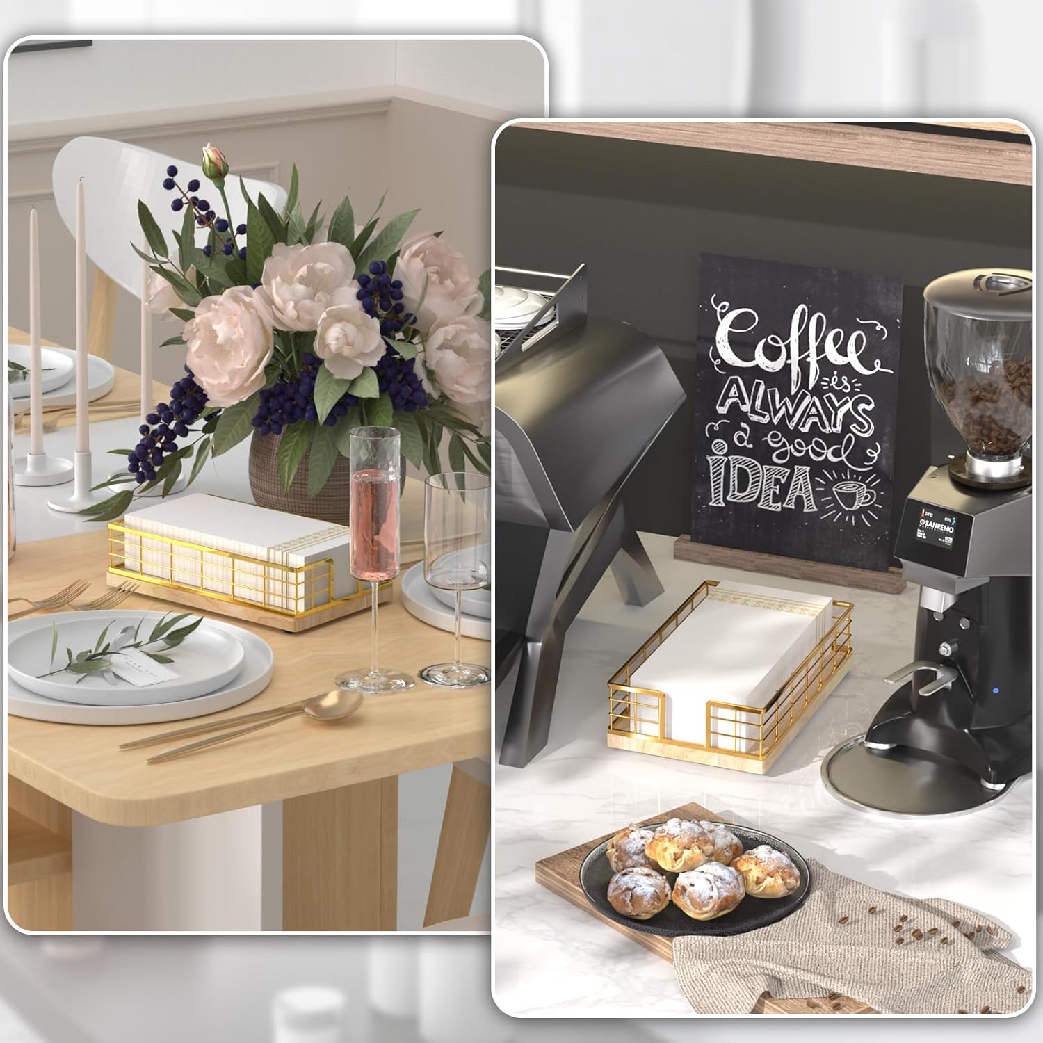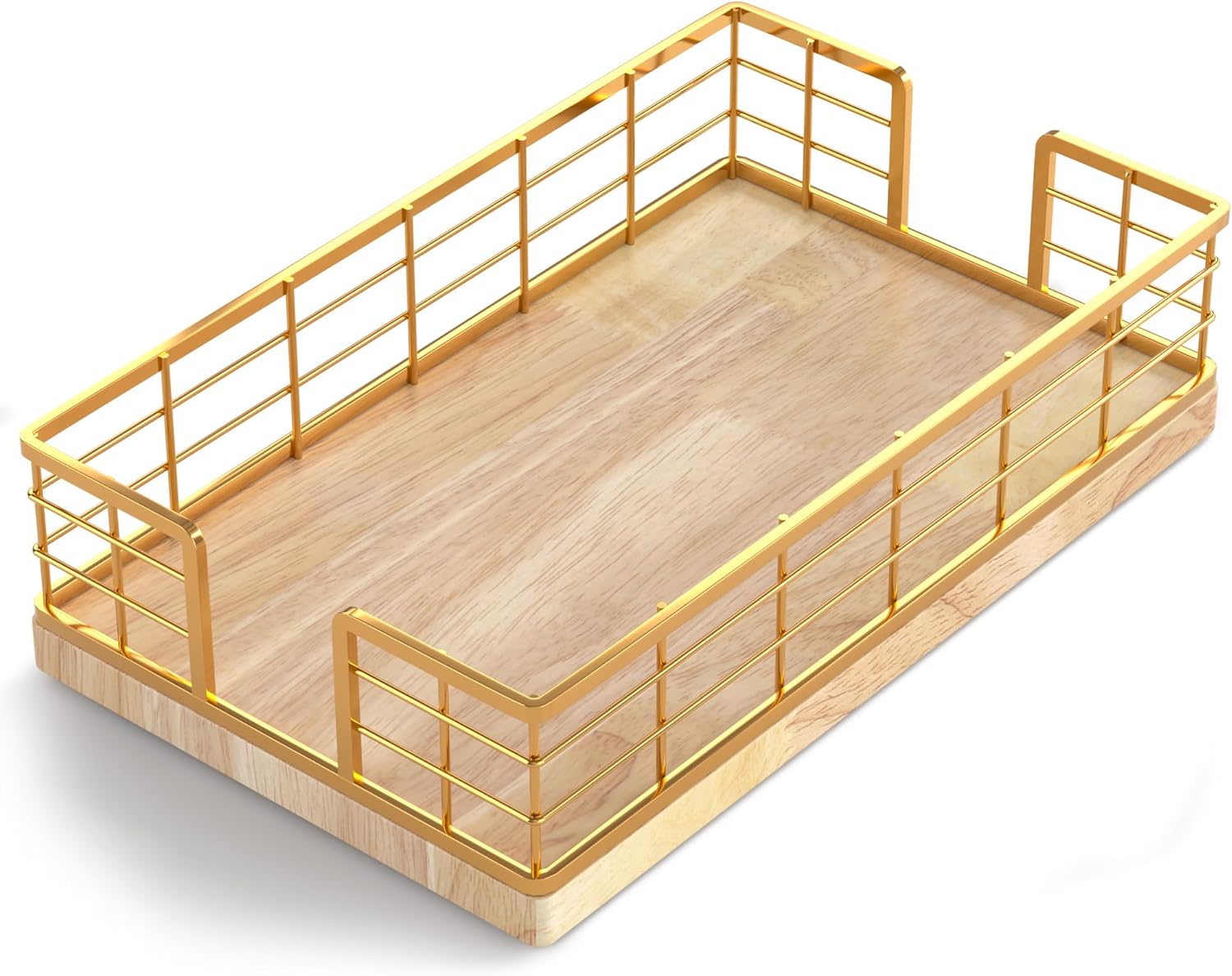 Wican Guest Towel Holder Tray for Bathroom, Oak and Iron Napkins Holder for Powder Room Dinning Table Wooden Basket for Disposable Paper Hand Towels Gold and Oak