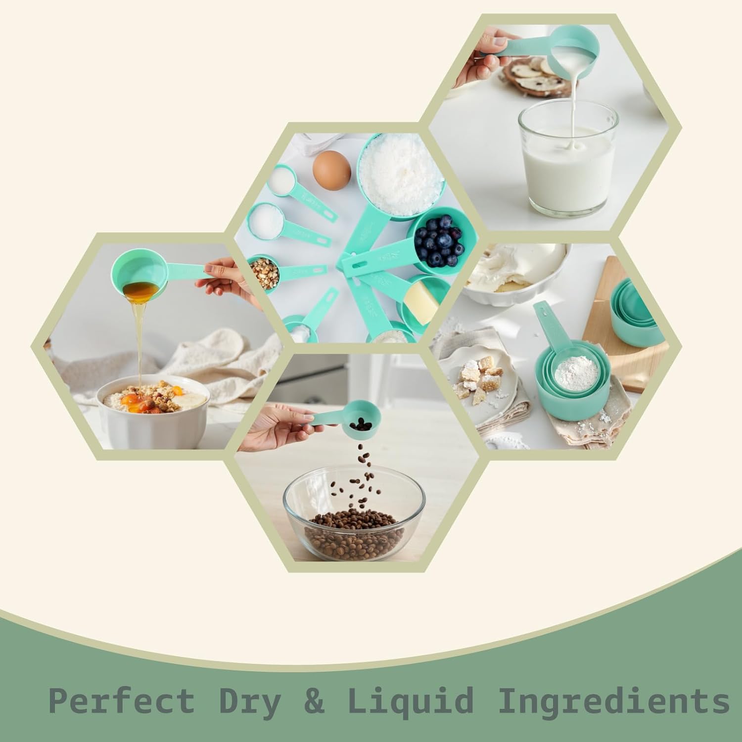 Inmorven 10pcs Measuring Cups and Spoons Set, BPA-Free Plastic Kitchen Baking Tools with Engraved Markings, Stackable Design for Dry & Liquid Ingredients (Green)