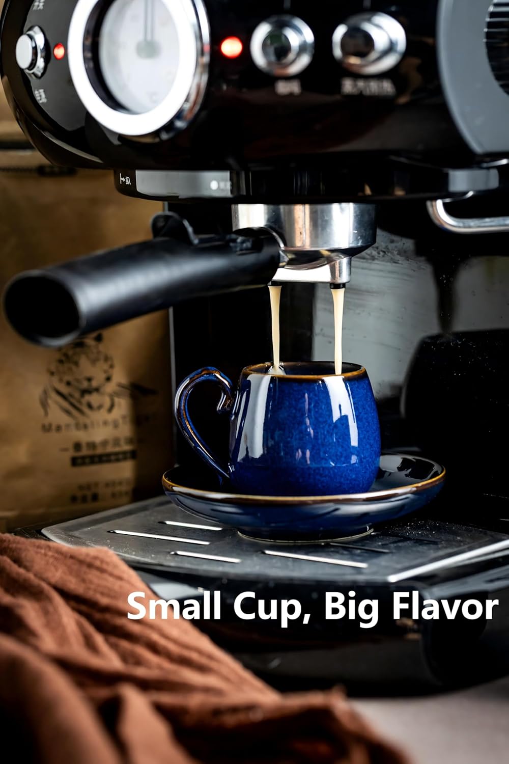 - Cute 3oz Espresso Set with a Pop of Color: Features 6 ceramic cobalt blue cups (3oz), round saucers, 6 spoons, and a sleek metal stand—ideal for espresso shots, mini mochas, or tea. The vibrant blue adds a fun, modern twist to your coffee routine