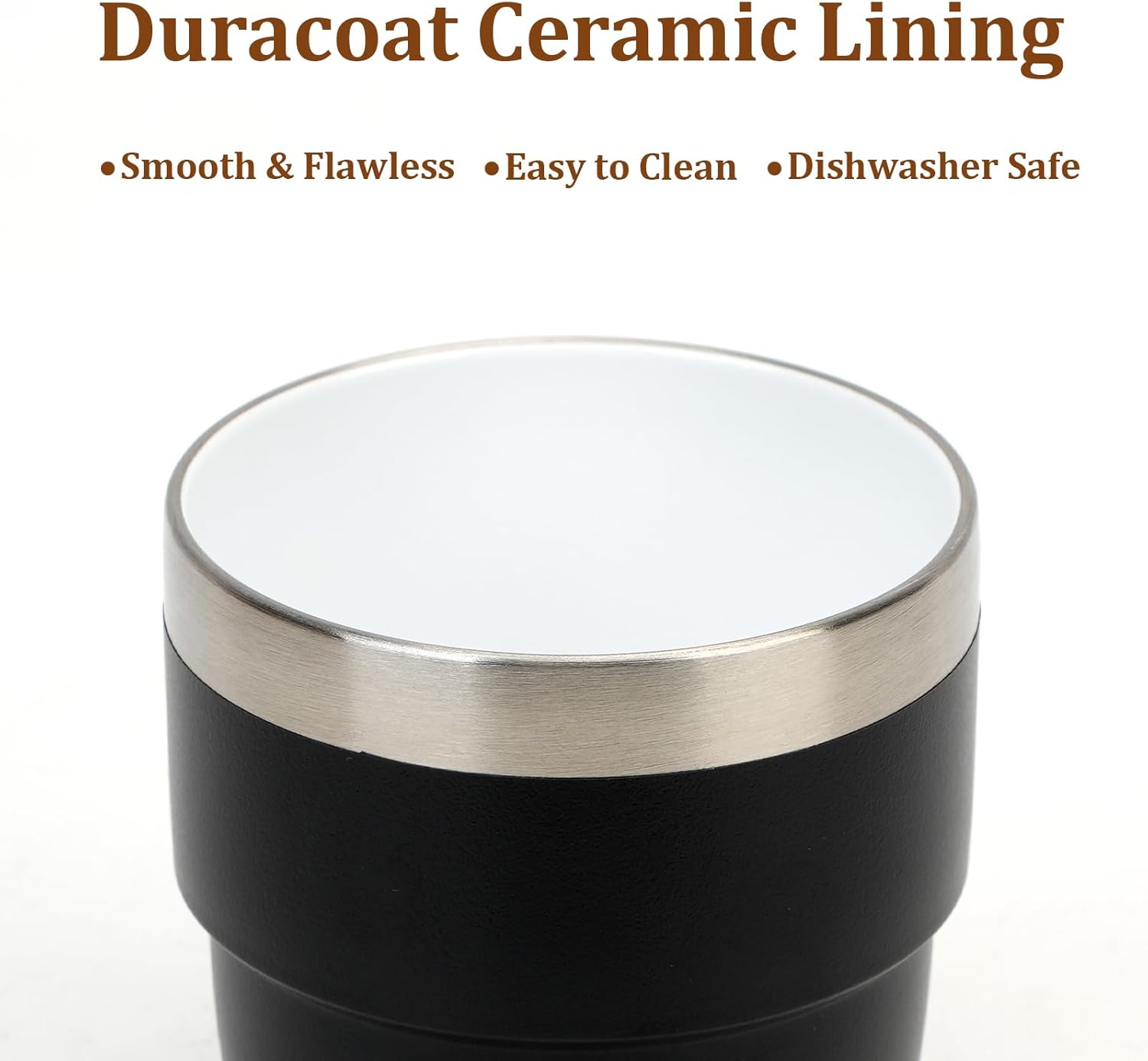 - Duracoat Ceramic Lining: The ceramic coating is smooth and flawless. It's a nice addition to the quality cups. Wonderful mouth feel and cleans up very easily. Dishwasher safe.