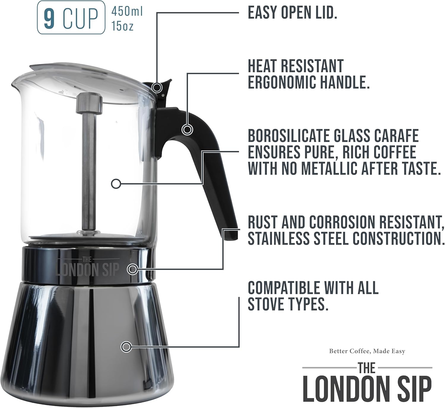 London Sip Glass and Stainless Steel Stovetop Espresso Maker Moka Pot Italian Coffee Percolator, Matte Black, Large (15.2 oz)