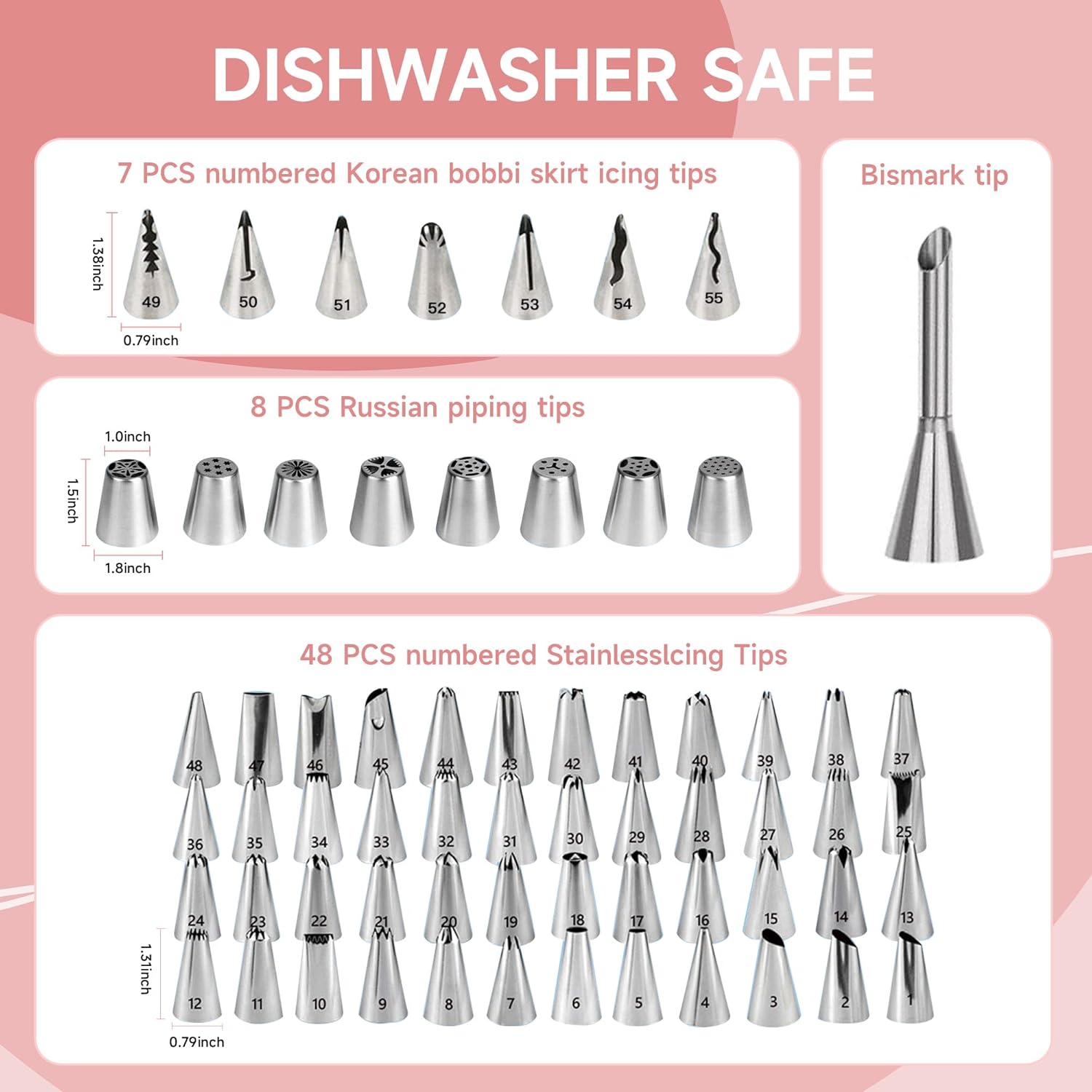 - Convenient Cake Decorating Supply Kit : This is FUN FOR ALL AGES AND SKILL LEVELS,This set having numbered piping tips with Pattern chart. So you don't have to worry about which tips produce what kind of decoration, just have a look on pattern chart where we have provided outcome of each tip to make tip selection,E-Book user guide includes The Cake Decorating supplies four levels,Each step Method of Cake Baking, Leveling & icing cakes, 3 frosting recipes, Step by step guide for using icing.