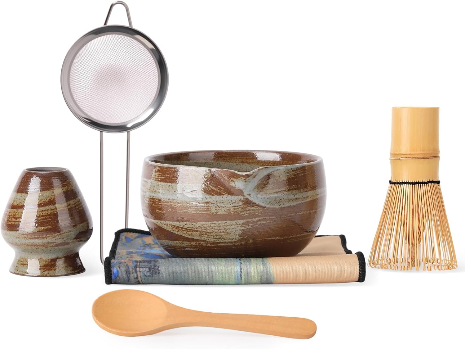 Japanese Matcha Whisk Set - 6-Piece Kit with Bamboo Chasen, Matcha Ceramic Bowl with Spout, Stainless Steel Sifter Brown