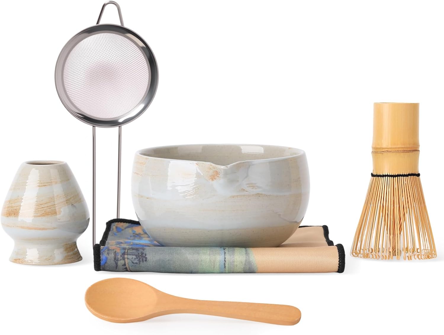 - Everything You Need: Includes:Ceramic matcha bowl with spout,Bamboo whisk + ceramic holder,Stainless sifter, bamboo scoop, microfiber towel