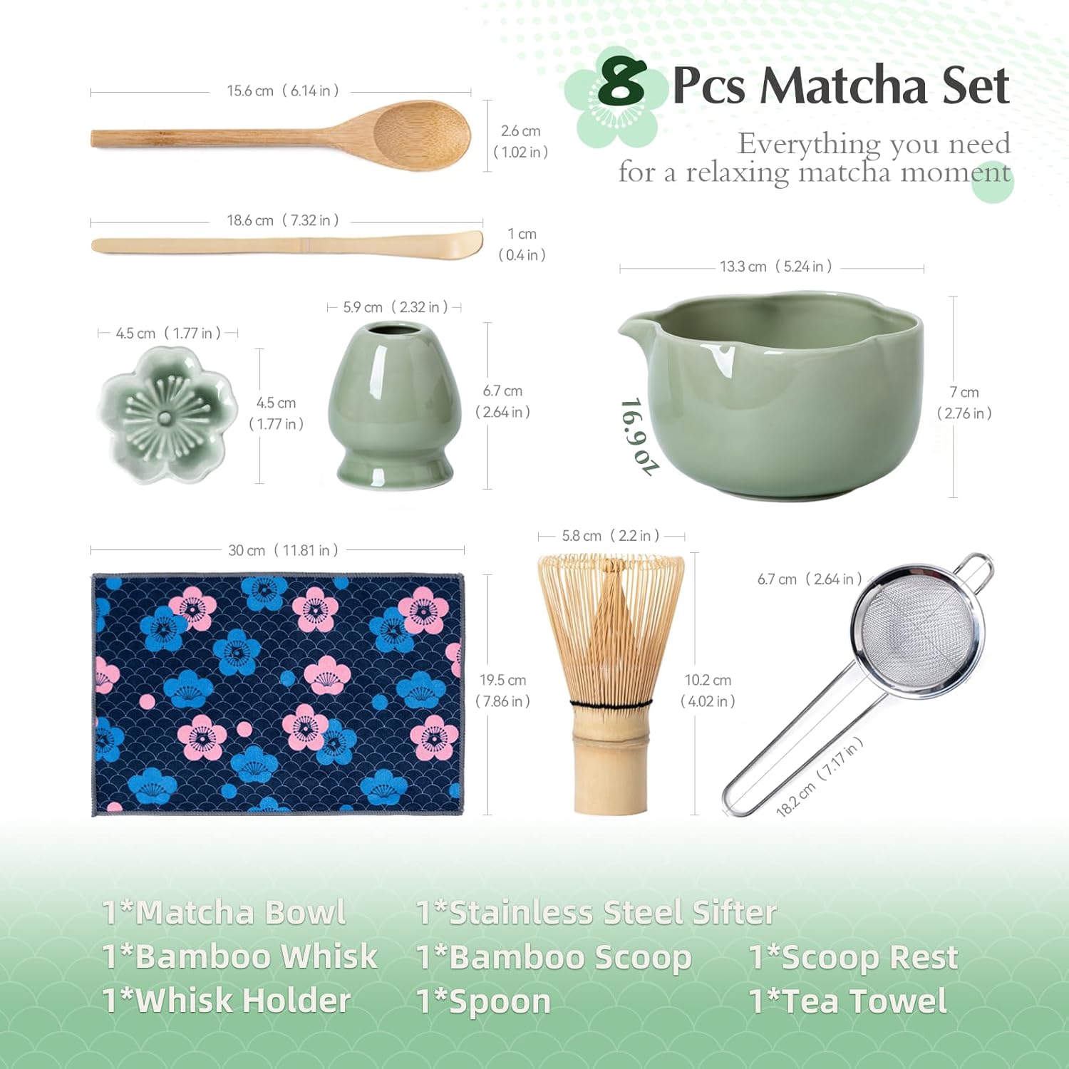 Matcha Set, 8Pcs Floral Ceramic Matcha Set with Matcha Whisk, Holder, Scoop, Scoop Rest, Sifter, Spoon and Tea Towel - Thoughtful Matcha Whisk Set Gift for Matcha Lovers (Green)