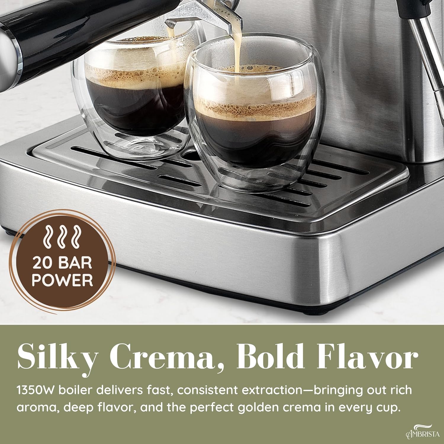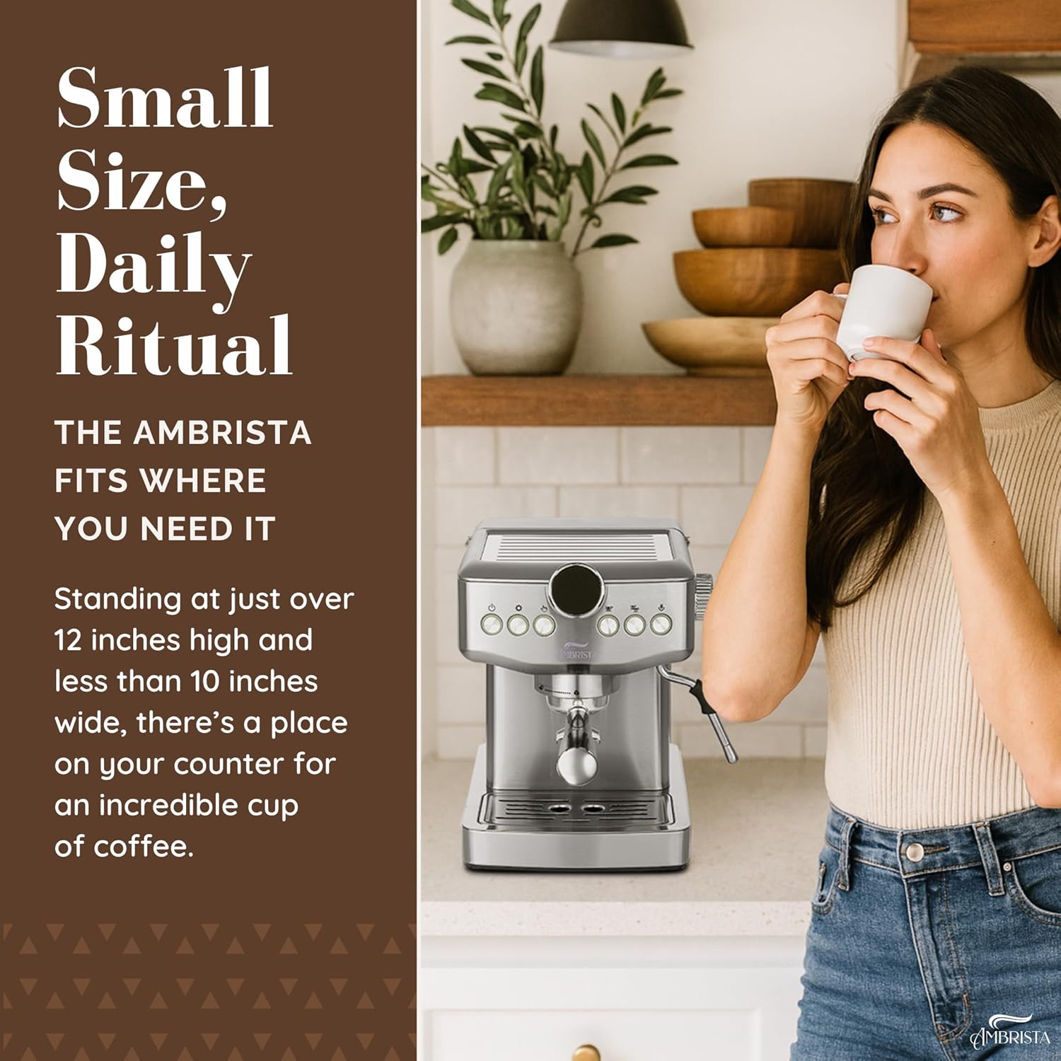 - MAKE YOUR FAVOURITE ESPRESSO COFFEE AT HOME! The AMBRISTA espresso machine with milk frother allows you to prepare all your favorite espresso based coffees. You can enjoy a barista brewed latte, cappuccino or macchiato at home. Stainless steel appearance, stylish and durable, ideal for any size kitchen. This compact espresso coffee maker is perfect for home or office use
