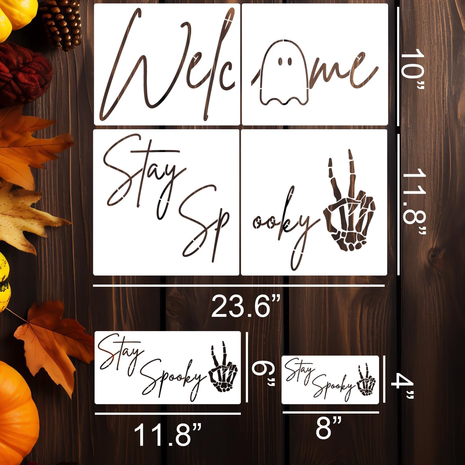 - Halloween Stencils:2 style Halloween stencils in 3 sizes:8inch,11.8inch and 23.6inch.Great for doormats,wood sign,fabrics decorating.