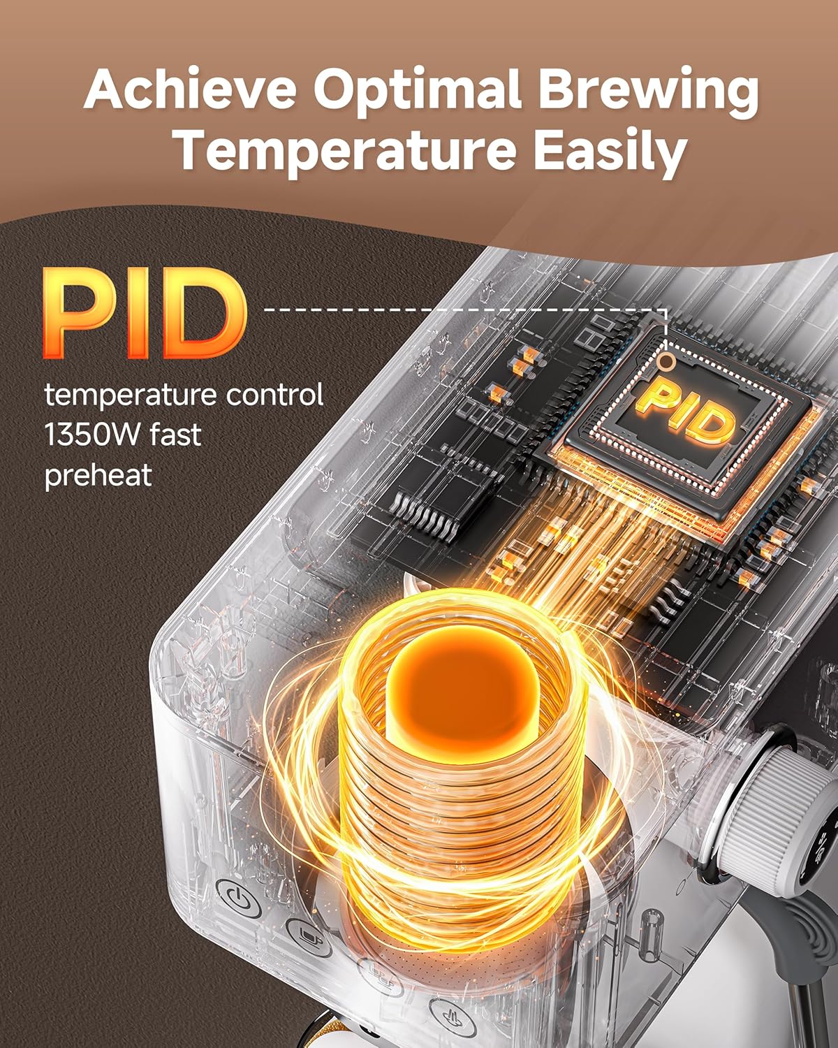 - 1350W Efficient Heating - Powerful preheating system heats in just 30 seconds while warming cups to preserve optimal temperature and flavor. With PID temperature control system controls the water temperature to a precise +/- 2°C, ensuring optimal espresso extraction