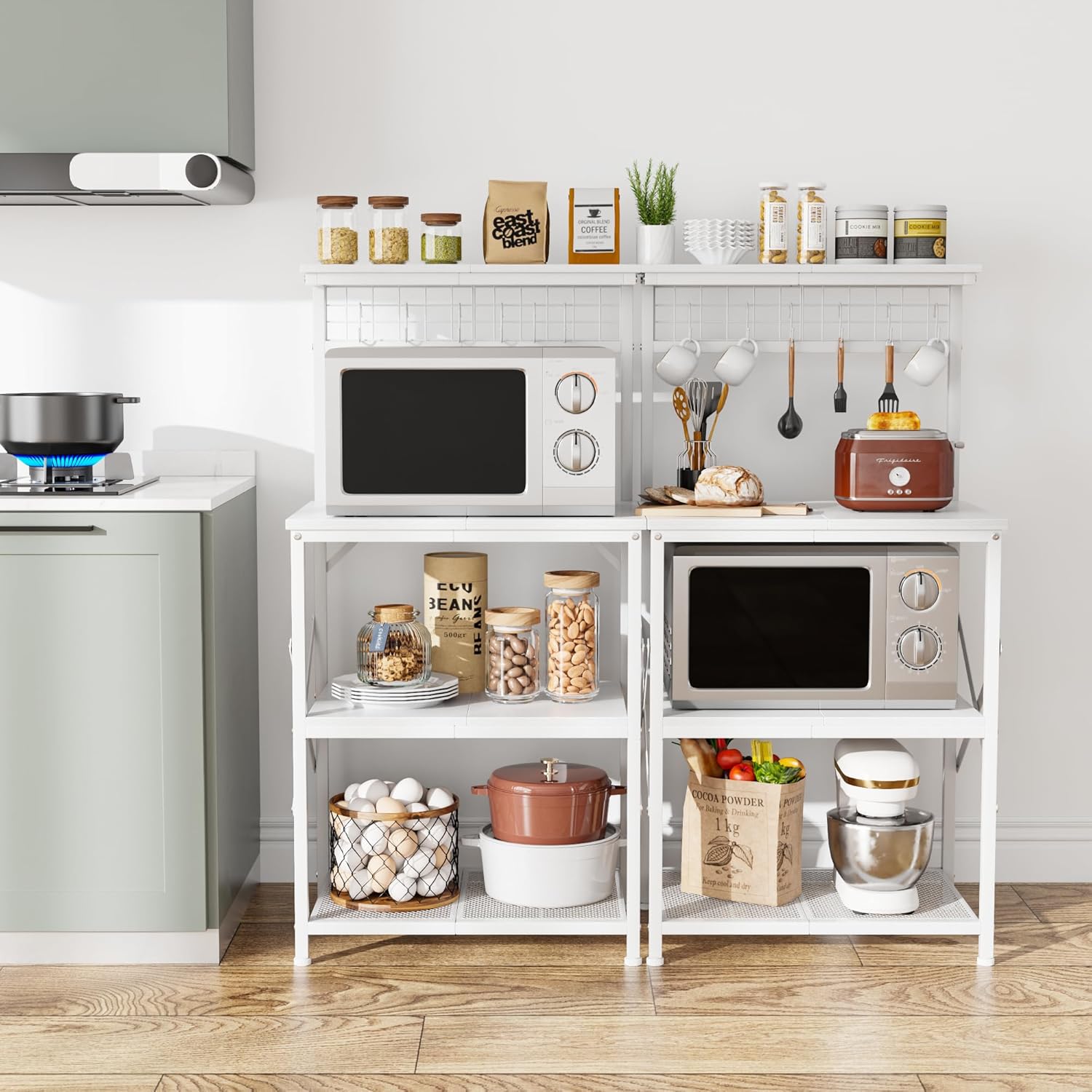 - [Metal Pegboard with 6 S Hooks]: The additional hutch with pegboard provides more storage space for small kitchen ware than other kitchen stand; DIY 6 S-shaped hooks for hang your mugs, spoons, etc. orderly.