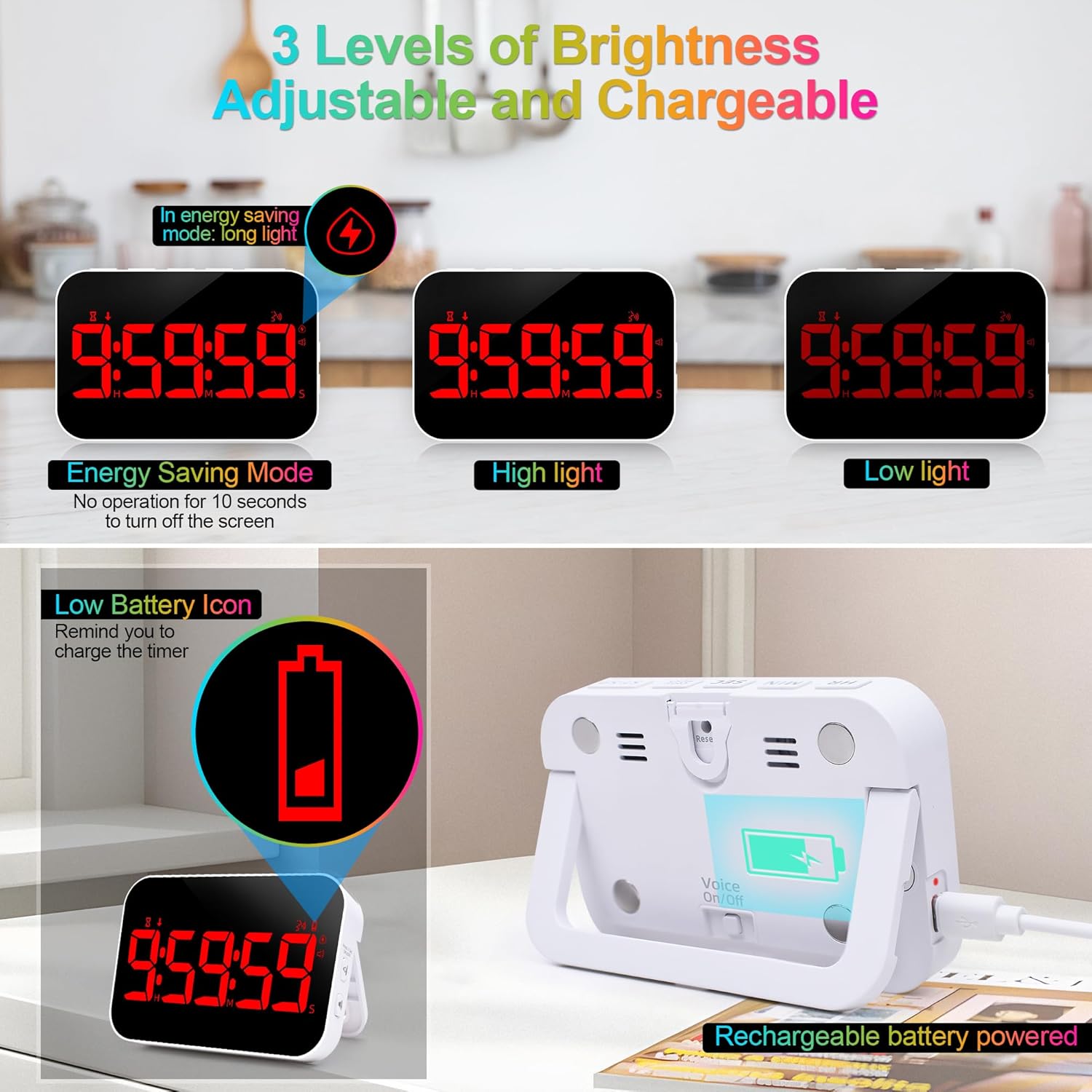 - 3 BRIGHTNESS AND 4 VOLUME ADJUSTABLE:This productivity timer features 4 reminder volumes: Mute (0 dB), Medium (60-75 dB), High (80-90dB) and vibration, you can choose the volume mode according to different usage scenarios.In addition, the kids timer also has 3 brightness modes adjustment: high, low and energy saving, so you can choose the brightness mode according to different usage scenarios (Note: energy saving mode makes the screen go to sleep after 10 seconds)