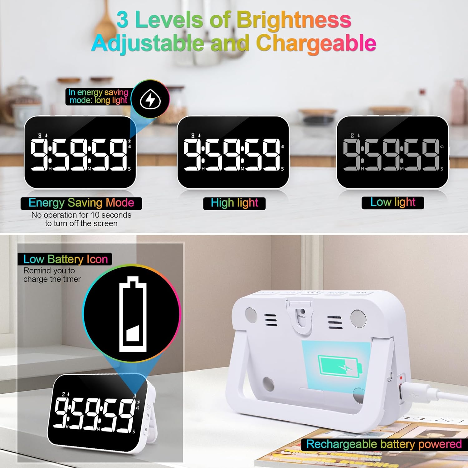 - RECHARGEABLE LED DISPLAY TIMER: Our kitchen timer doesn't need additional batteries, the built-in battery supports Type-C charging (charging cable included in the package). Big and bold digits and clear large 5" LED display timer can work for at least 5 hours in Hight light mode. When the battery is low, a low battery indicator will be displayed in the upper right corner. Great for kids and seniors, you can easily make it work too