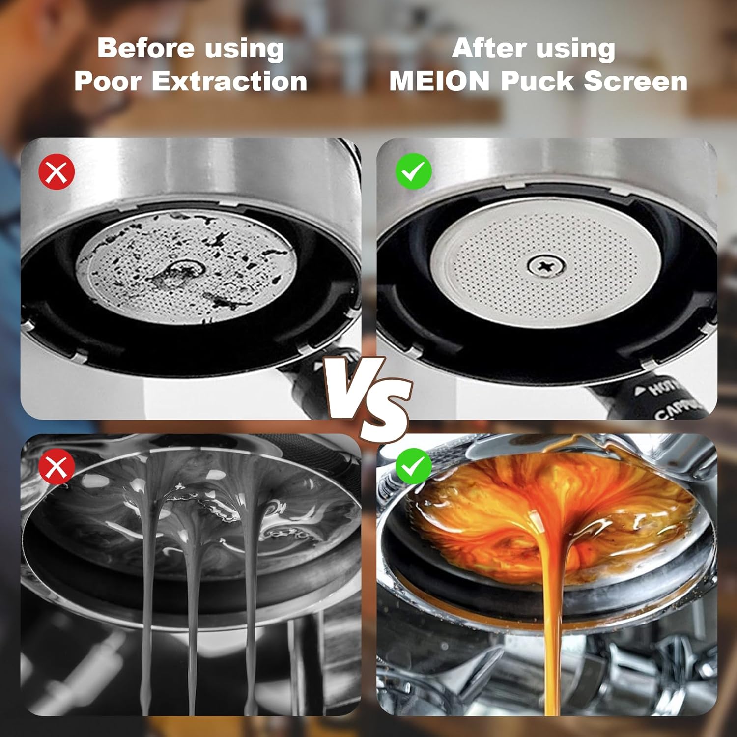 - 【Improved performance】 0.2mm Ultra-Thin Dual-Layer Design, MEION 53.3mm espresso puck screen features optimized perforations that evenly disperse water across your coffee pack. It prevents channeling, boosts extraction stability, and delivers barista-quality consistency in every shot.