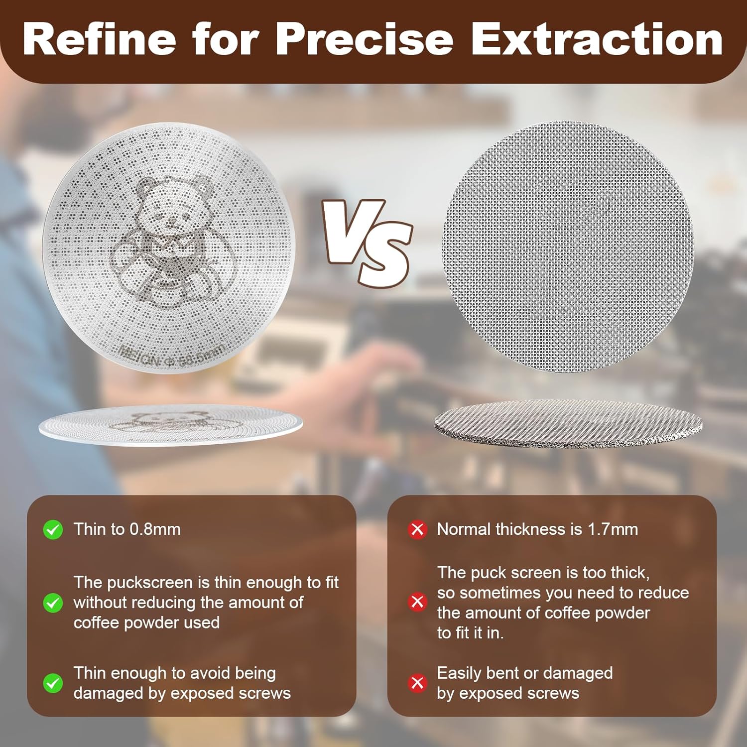 - 【Improved performance】0.8mm Ultra-Thin Dual-Layer Design, MEION 53.3mm espresso puck screen features optimized perforations that evenly disperse water across your coffee pack. It prevents channeling, boosts extraction stability, and delivers barista-quality consistency in every shot.