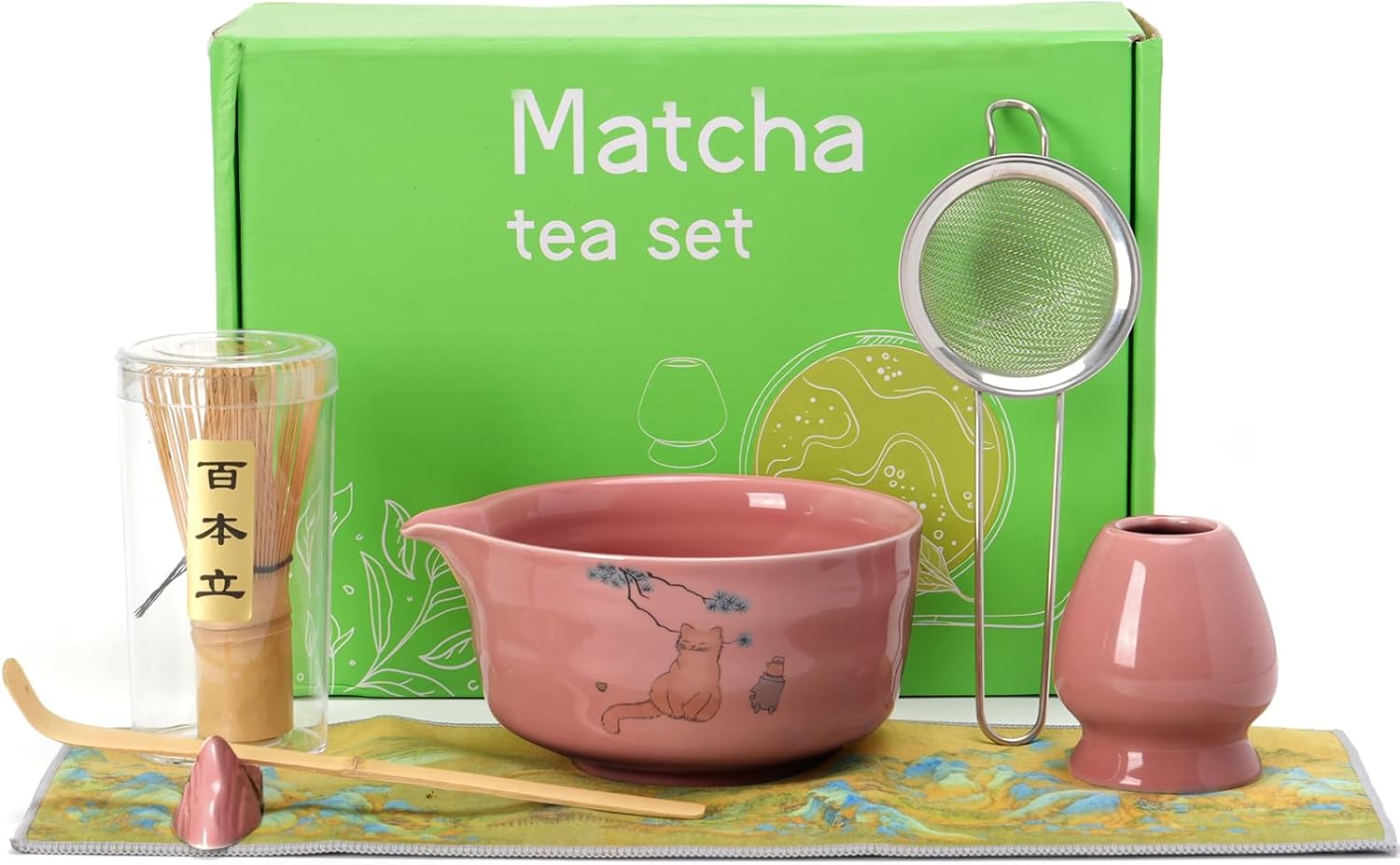 Matcha Set - Japanese Matcha Kit Set 7-Pcs: Ceramic Bowl (Chawan), Matcha Whisk and Holder, Bamboo Scoop, Scoop Rest, Sifter and Towel - Authentic Tea Ceremony Tools for Tea Lovers (Hot Pink)